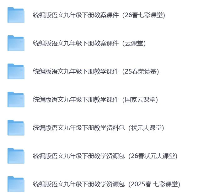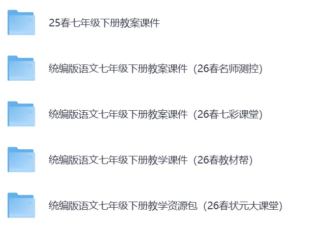 2026春最新人教部编版语文7-9年级下册教案课件教学资源包(持续更新)·可免费下载。覆盖初一至初三全年级下册。七八九年级下册内含优质教案、精美 PPT、同步练习等全套教学资料,紧扣教材、实用省心。助力老师高效备课、轻松教学,提升课堂质量与教学效率。25春七年级下册教案课件教学资源包