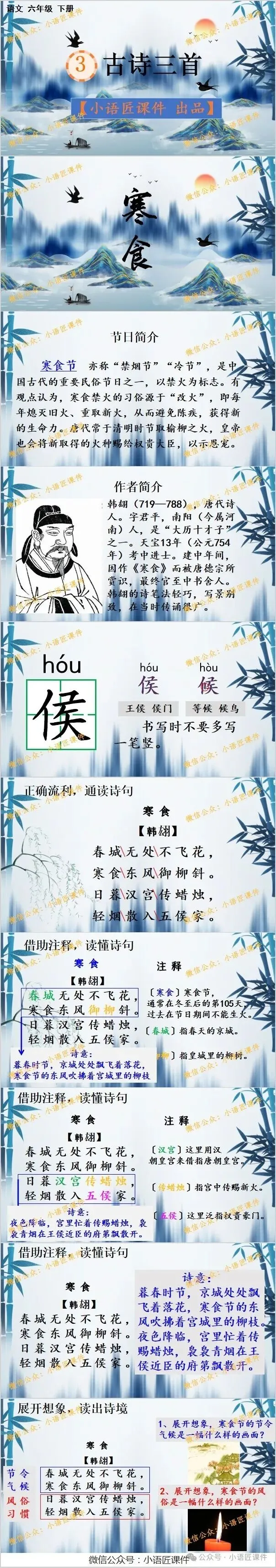 大家好,我是小语匠课件!今天给大家分享六年级下册《古诗三首》《寒食》《十五夜望月》《迢迢牵牛星》的独家课件。