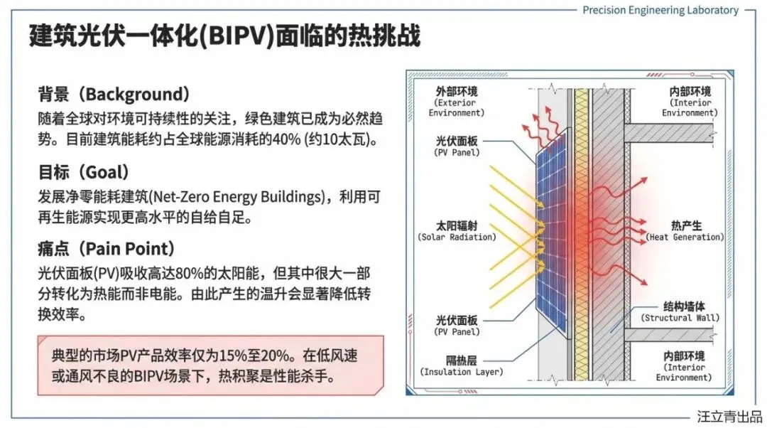 随着全球人口增长,我们的城市正变得越来越“电力饥渴”,预计到2050年,建筑物的能量需求将从现在的10太瓦暴增到30太瓦。为了应对这种挑战,光伏建筑一体化(BIPV)技术应运而生,它不再是简单地在屋顶架设太阳能板,而是让房子的外墙直接变成“微型发电站”。然而,这些发电外墙有一个致命伤:怕热。在热带地区,太阳能电池板在阳光曝晒下效率会大幅下降,温度每升高1度,转化效率就会跌掉一截。如果通风不好,这些板子在户外甚至能烧到80℃以上,这不仅会缩短设备寿命,还会让发电量大打折扣。