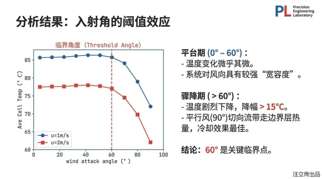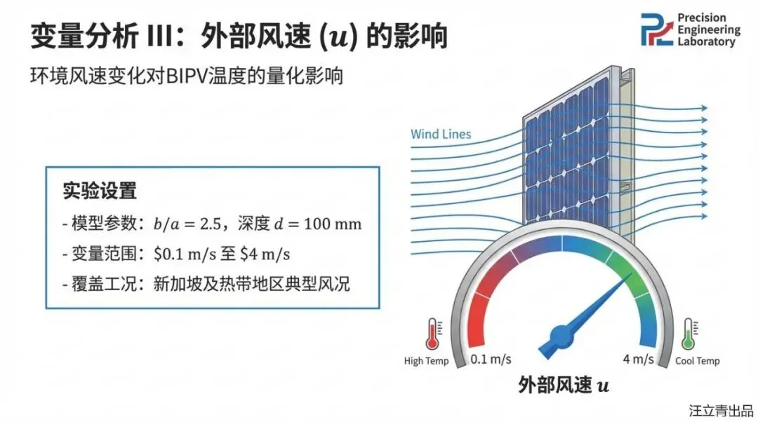 那么,这层空气层到底留多宽最合适呢?研究给出了一个“黄金区间”:气腔深度最好在80到125毫米之间。在这个宽度内,降温效果性价比最高;如果缝隙太窄,空气跑不动;太宽了,又会占用过多的建筑空间。此外,风的速度和吹来的角度也是关键。当风速增加时,面板温度会显著下降;特别神奇的是,当风从侧面以超过60度的角度斜吹过来时,面板温度甚至能瞬间暴跌15℃以上。这意味着,如果我们能根据当地的常年风向来调整发电外墙的朝向,它的性能还能再上一个台阶。