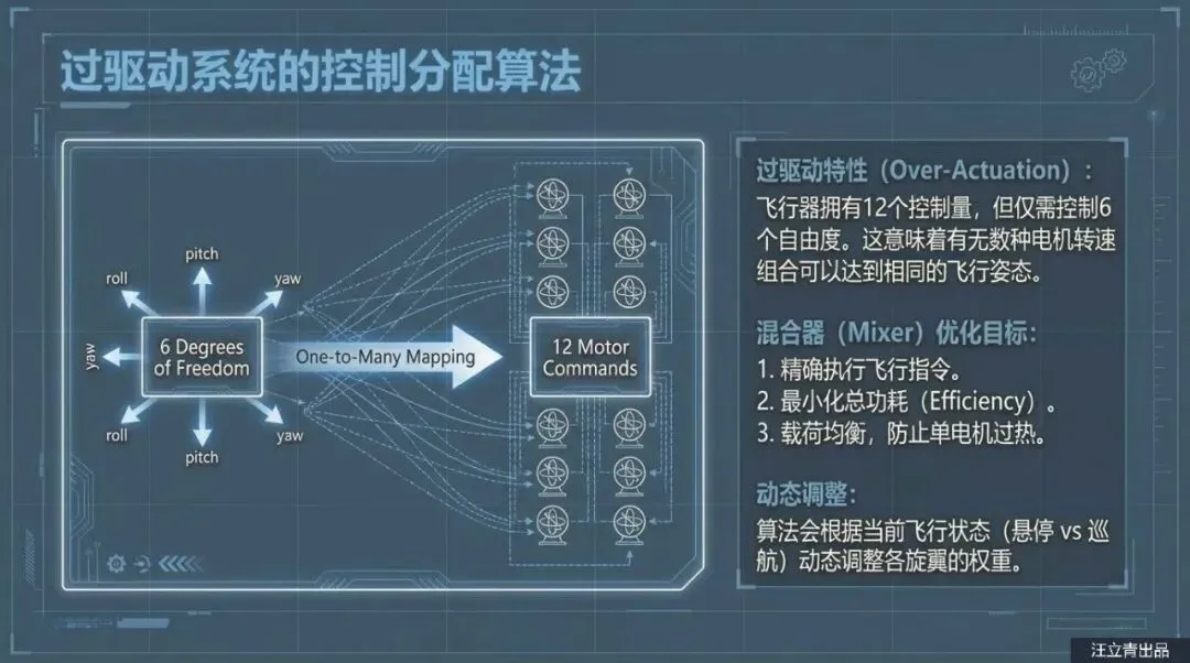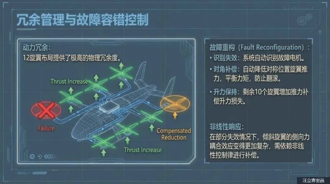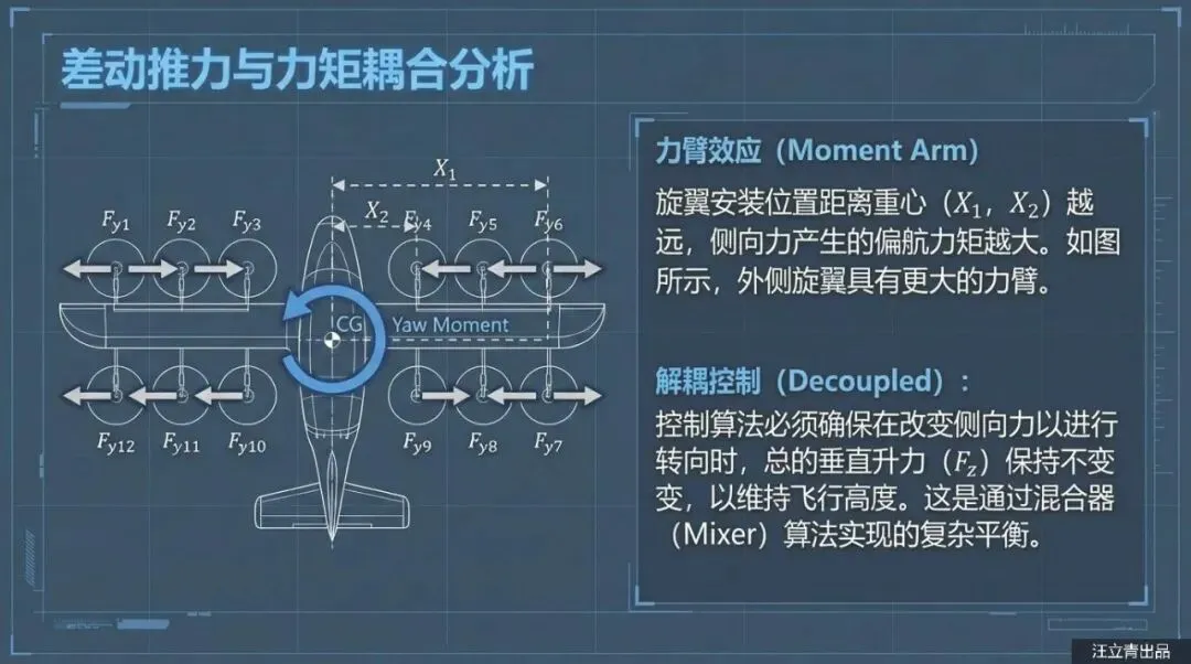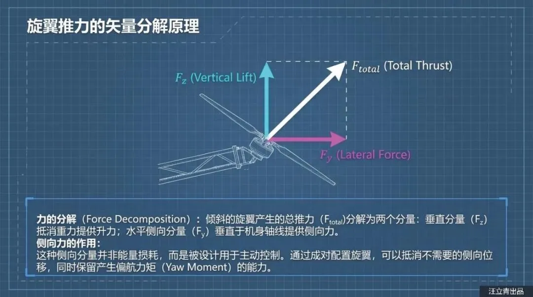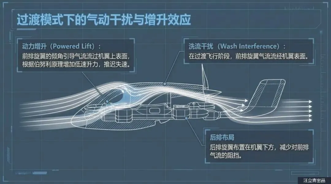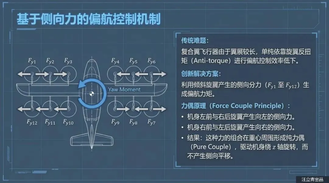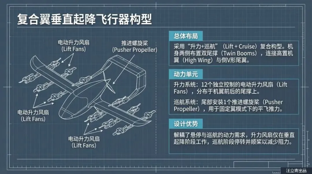 除了保命,这些“歪”着的螺旋桨还是提升飞行操控感的秘密武器。普通的四旋翼无人机要想横着飞或者原地转圈(偏航),通常需要复杂的机械结构或者大幅度调整机身姿态。但在这个设计里,因为螺旋桨本来就是斜着的,它们在产生升力的同时也自带了“侧向力”。通过调节不同位置电机的转速,飞行器可以极其灵活地在空中完成侧移、抗侧风飞行和旋转,完全不需要那些容易坏的倾转机械机构。而且,这架飞机还采用了复合翼布局,机翼后方装了一个专门的推力螺旋桨,负责巡航时的加速。起飞时靠那一排排“歪”风扇拔地而起,平飞时靠尾部推力高速巡航,既保证了垂直起降的灵活性,又兼顾了飞得远、飞得快的需求。