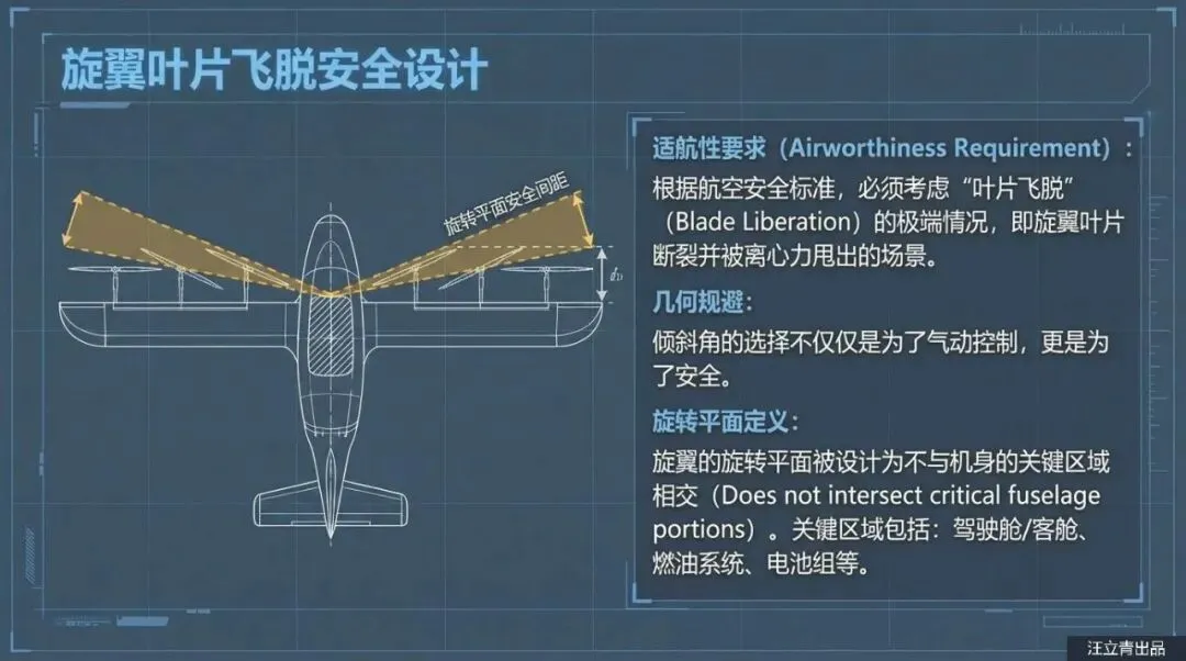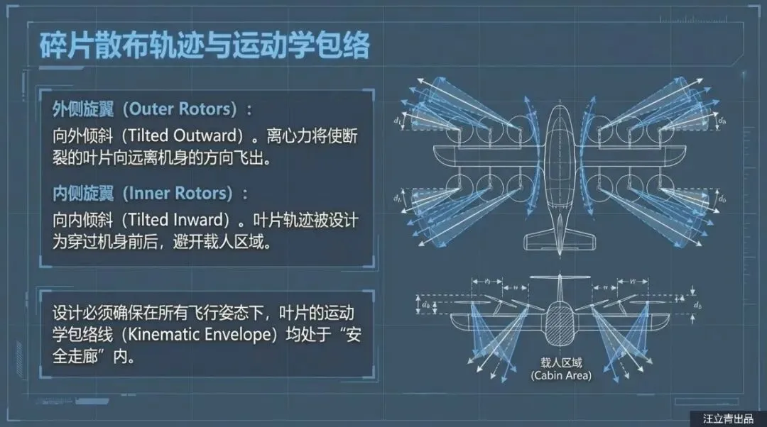 为什么要费尽心思把螺旋桨装歪呢?这里面最大的考量就是两个字:安全。咱们都知道,螺旋桨高速旋转时蕴含着巨大的能量,万一遇到极端情况,比如桨叶断裂或者整个电机脱落,那个破坏力简直像飞出来的子弹一样恐怖。如果螺旋桨是水平安装的,飞出来的碎片很容易直接切进机舱,伤到里面的乘客,或者打坏机身里的关键设备。而这项专利的核心“黑科技”就在于,通过精确计算,让每个螺旋桨的旋转平面都巧妙地避开机舱和乘客区。简单来说,就是万一螺旋桨炸了,碎片只会往外飞或者往无人区飞,绝对不会“误伤友军”。这种通过几何角度来被动提升安全性的思路,简直是给未来的空中乘客吃了一颗定心丸。