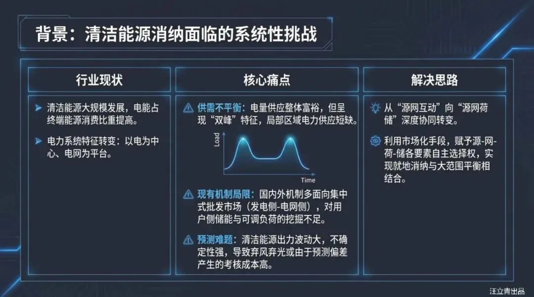 咱们天天喊着大力发展风电、光伏等清洁能源,但现实却很骨感:这些新能源脾气太大,完全“靠天吃饭”,出力极度不稳定。老天爷一高兴,电量多得用不完;天气一差,局部区域立刻面临电力短缺,供需两头经常出现尴尬的“双峰”不平衡现象。过去的传统思路往往是让火电、抽水蓄能去给新能源“擦屁股”,以此来提供消纳辅助服务,却极大地忽略了广大用户侧储能和可调负荷的巨大潜力。说白了,如果只管无脑建大风车和太阳能板,却缺乏一个聪明的市场机制来引导用电端和储能设备主动配合,那发出来的绿电不仅难以被系统全额消纳,还会对整个电网的安全运行造成巨大的冲击,产生极高的无效交易风险。
