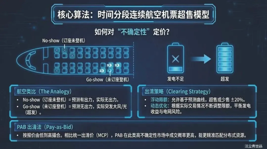 更让人拍案叫绝的是这套机制配套的“三大神仙交易品种”和极其接地气的“机票超售”算法。首先,当清洁能源面临局部受限时,可以直接花钱购买储能和柔性负荷的“调节服务”,让原本自行充放电的储能设备乖乖听从电网需求来充电,把多余的绿电存起来。其次,储能还可以充当“避震器”,全程跟踪新能源的出力变化,平抑那些难以提前预测的巨大波动。最牛的是第三招——“偏差电量交易”,因为风电光伏预测总是不准,现在允许那些出现预测正负偏差的新能源电厂在平台上“私下换电”,通过互相抵消偏差来实现互保互救,直接免除了高昂的预测不准罚款。此外,考虑到新能源“看天发呆”的不确定性,交易平台极其聪明地借用了“航空机票超售”的逻辑,允许发电方在预测曲线基础上有20%的超售或少售额度,这种满座即飞的约时成交模式,极大地调动了小微主体和储能设施的参与热情。