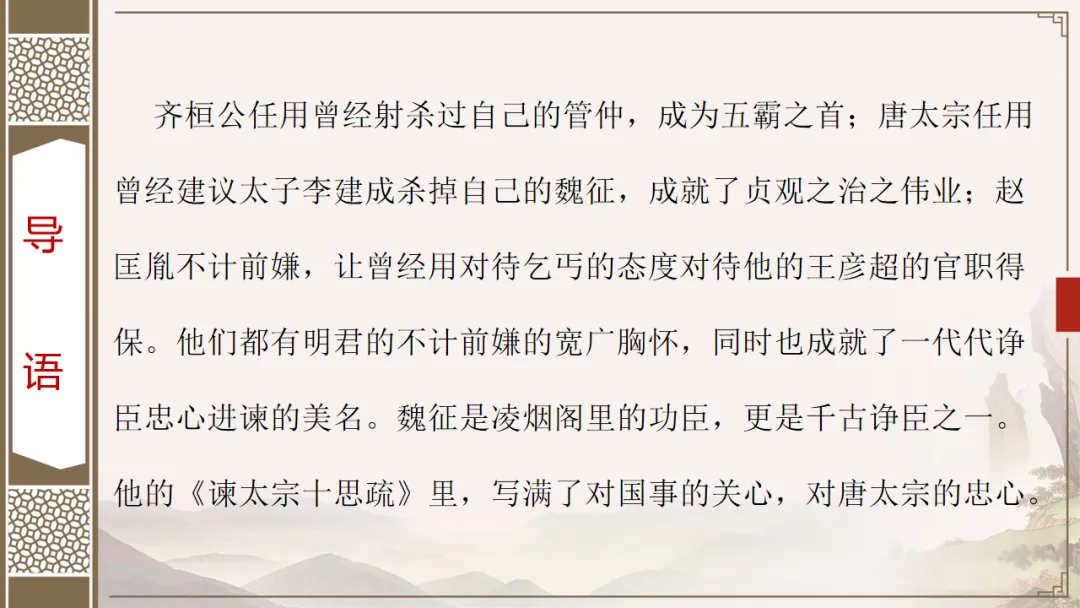 齐桓公任用曾经射杀过自己的管仲,成为五霸之首;唐太宗任用曾经建议太子李建成杀掉自己的魏征,成就了贞观之治之伟业;赵匡胤不计前嫌,让曾经用对待乞丐的态度对待他的王彦超的官职得保。他们都有明君的不计前嫌的宽广胸怀,同时也成就了一代代诤臣忠心进谏的美名。魏征是凌烟阁里的功臣,更是千古诤臣之一。他的《谏太宗十思疏》里,写满了对国事的关心,对唐太宗的忠心。
