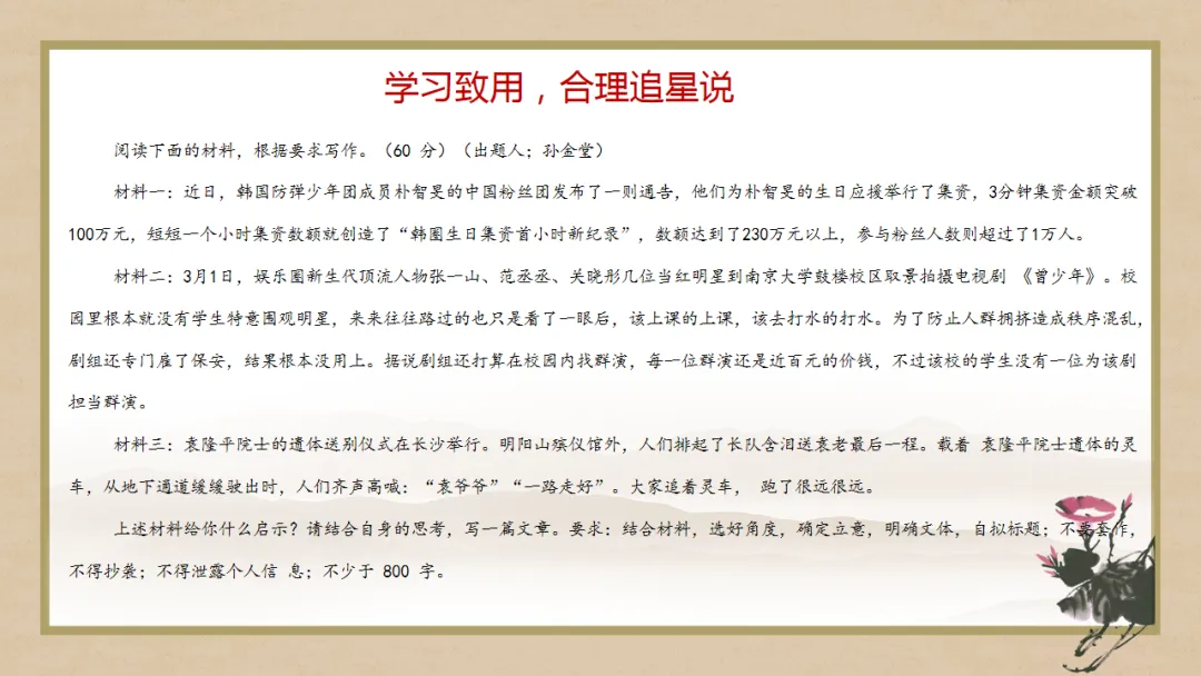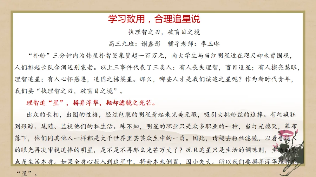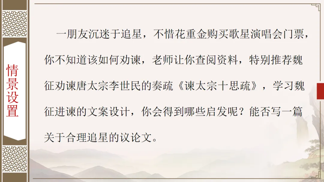 情景设置:一朋友沉迷于追星,不惜花重金购买歌星演唱会门票,你不知道该如何劝谏,老师让你查阅资料,特别推荐魏征劝谏唐太宗李世民的奏疏《谏太宗十思疏》,学习魏征进谏的文案设计,你会得到哪些启发呢?能否写一篇关于合理追星的议论文。