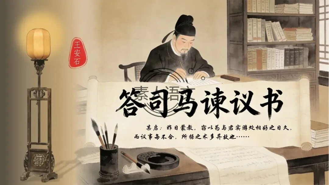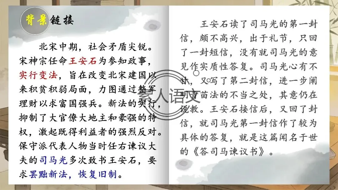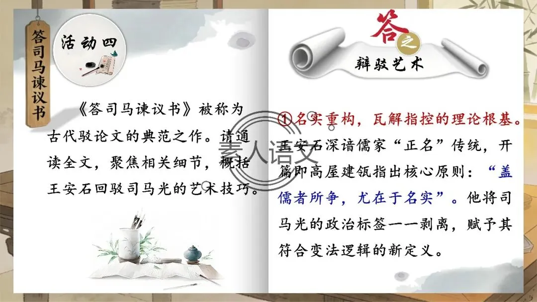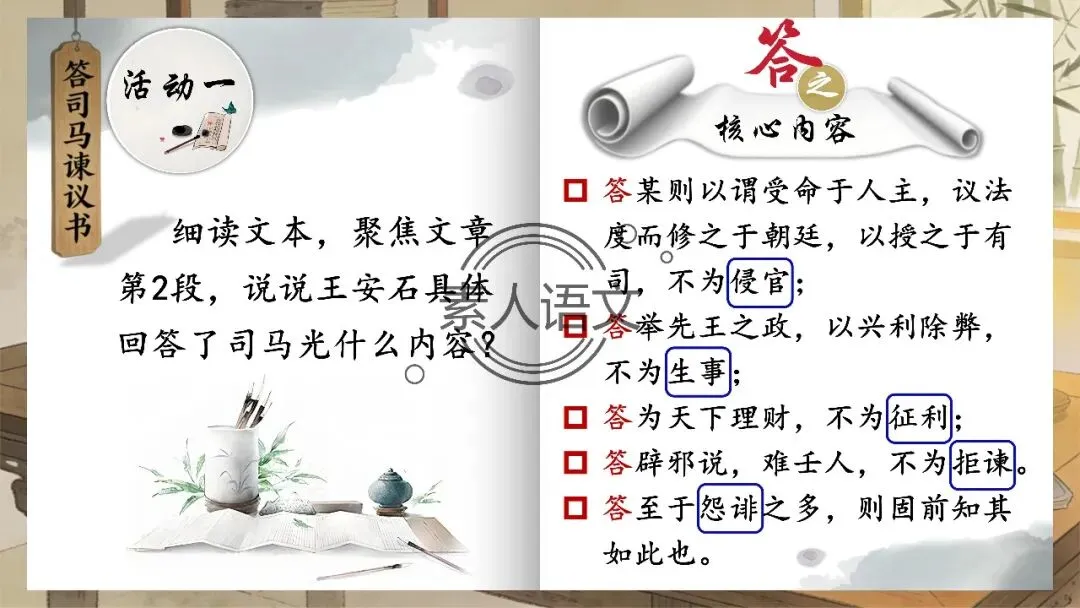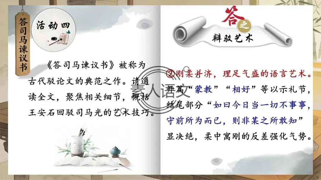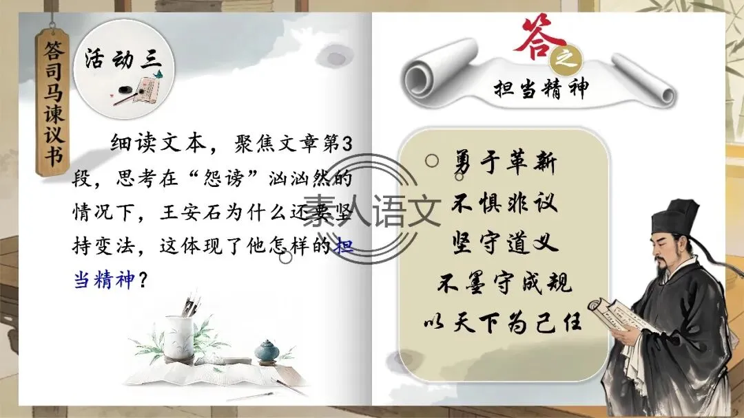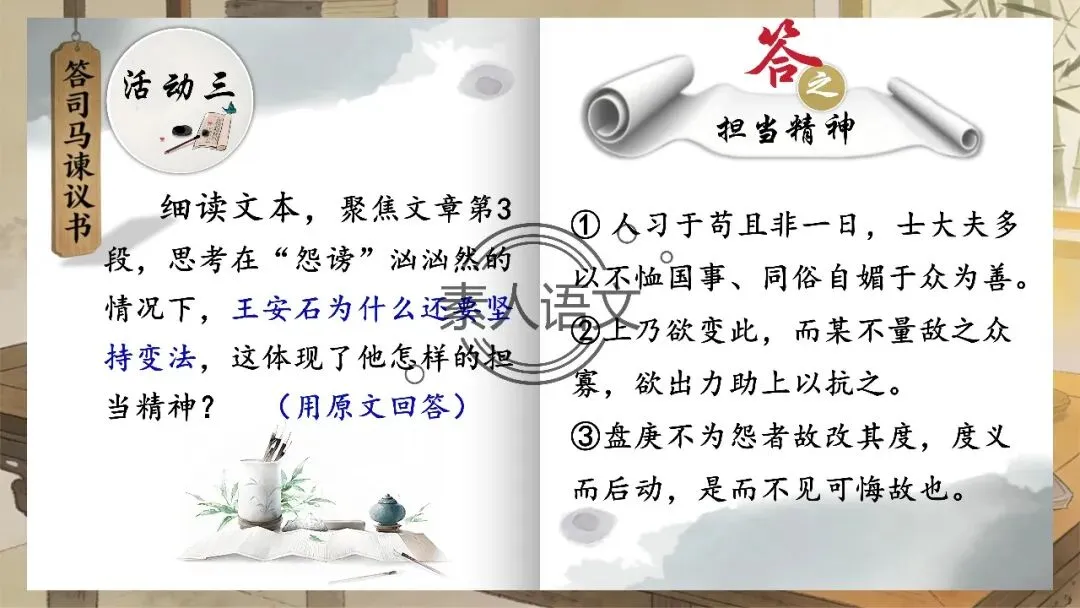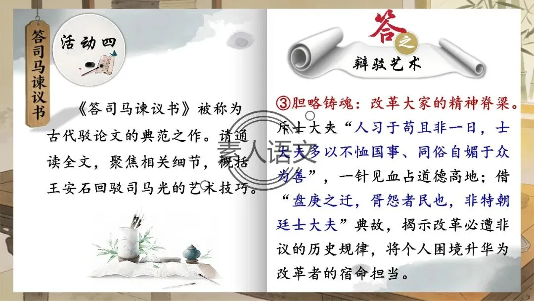 小伙伴们好,今天推出的课件是《答司马谏议书》。本课进行的是常态课设计,分三个部分进行教学,共设计五个活动。 活动一:细读文本,聚焦文章第2段,说说王安石具体回答了司马光什么内容?活动二:王安石和司马光的关系颇为微妙,同朝为官,既为故交又是政敌。请结合所学知识,谈谈司马光为什么极力反对王安石的变法? 活动三:细读文本,聚焦文章第3段,思考在“怨谤”汹汹然的情况下,王安石为什么还要坚持变法,这体现了他怎样的担当精神? 活动四: 《答司马谏议书》被称为古代驳论文的典范之作。请通读全文,聚焦相关细节,概括王安石回驳司马光的艺术技巧。
