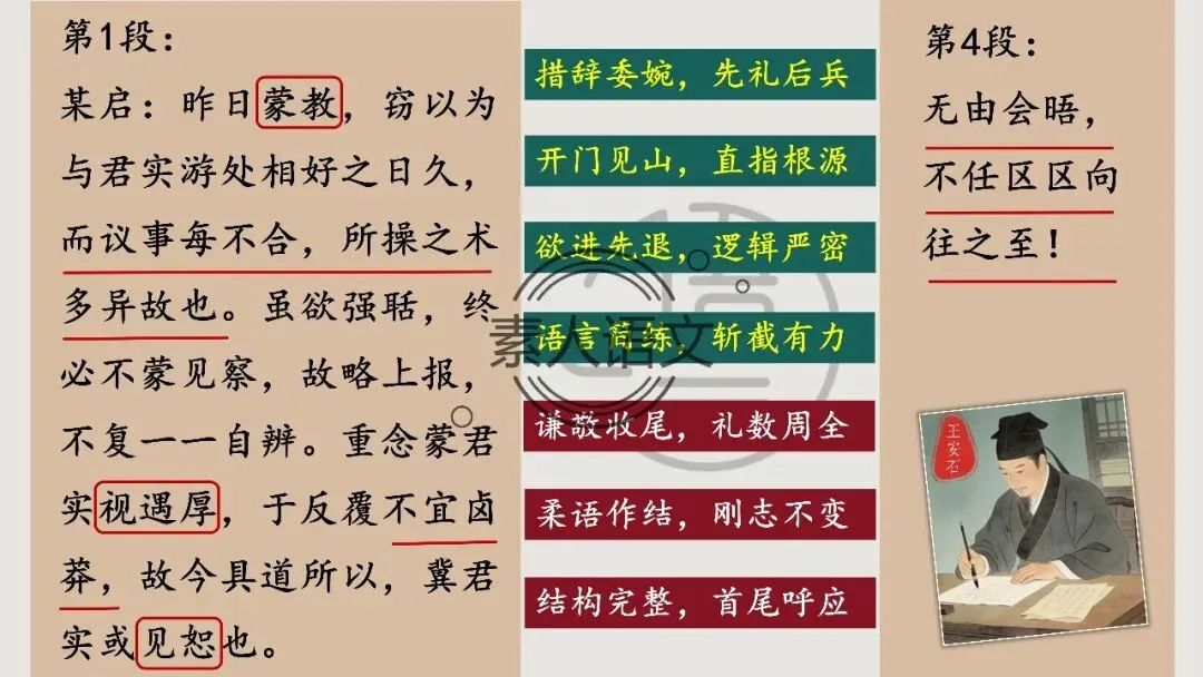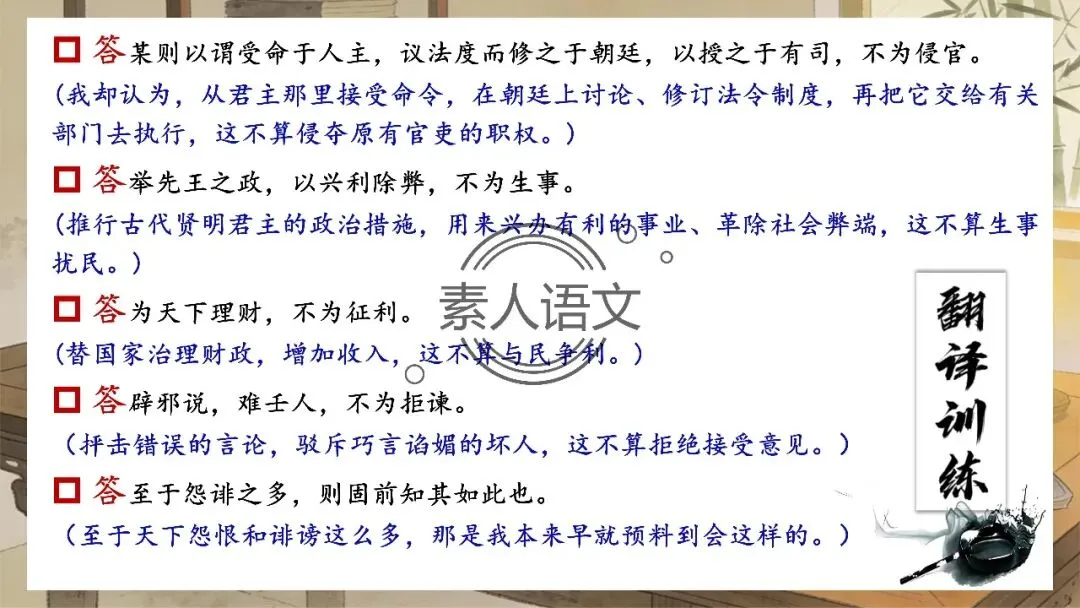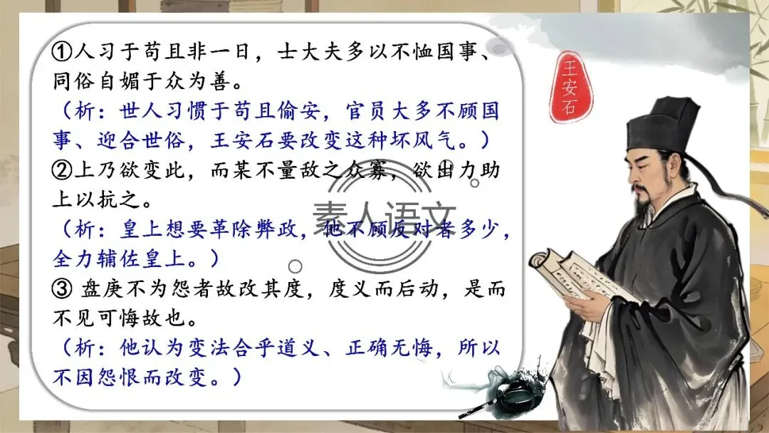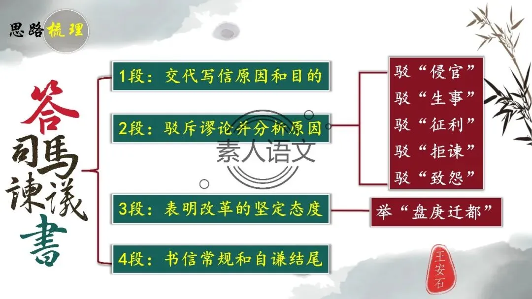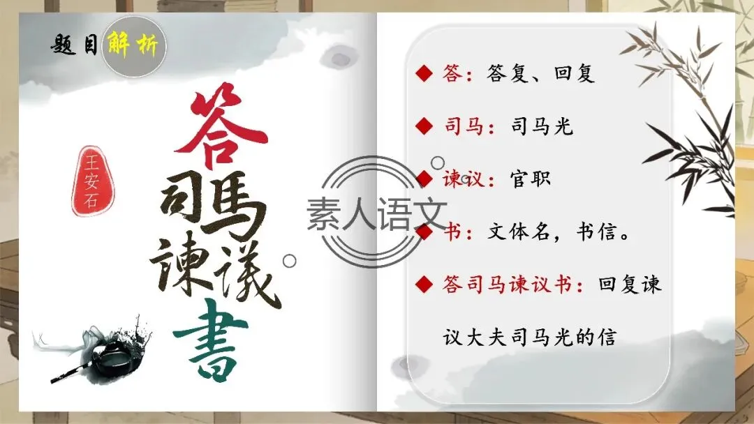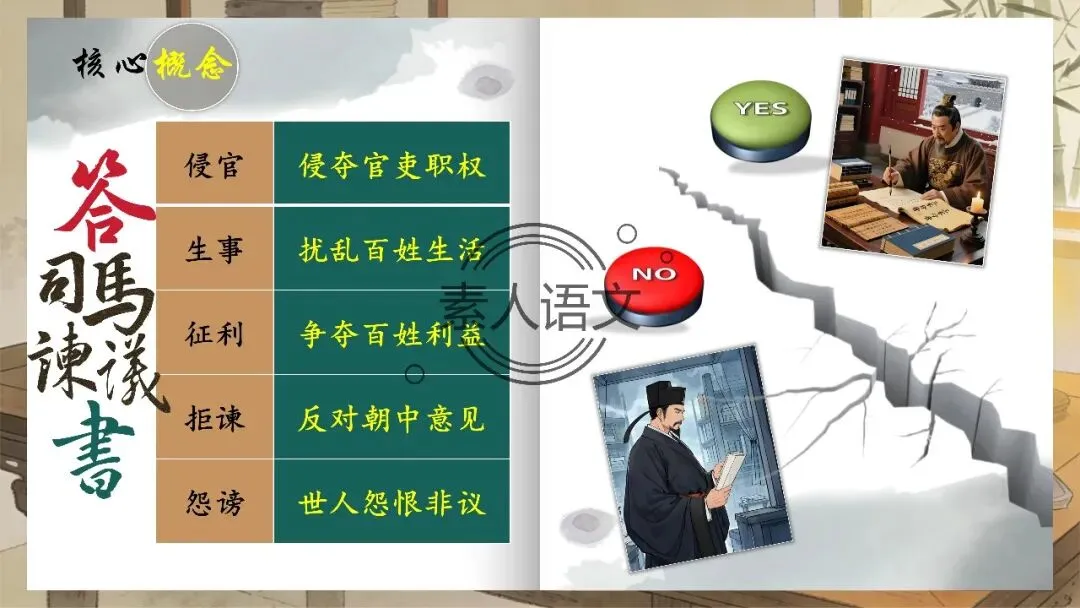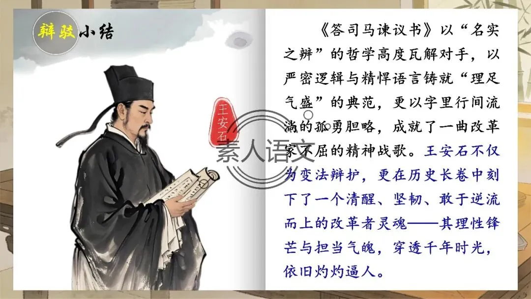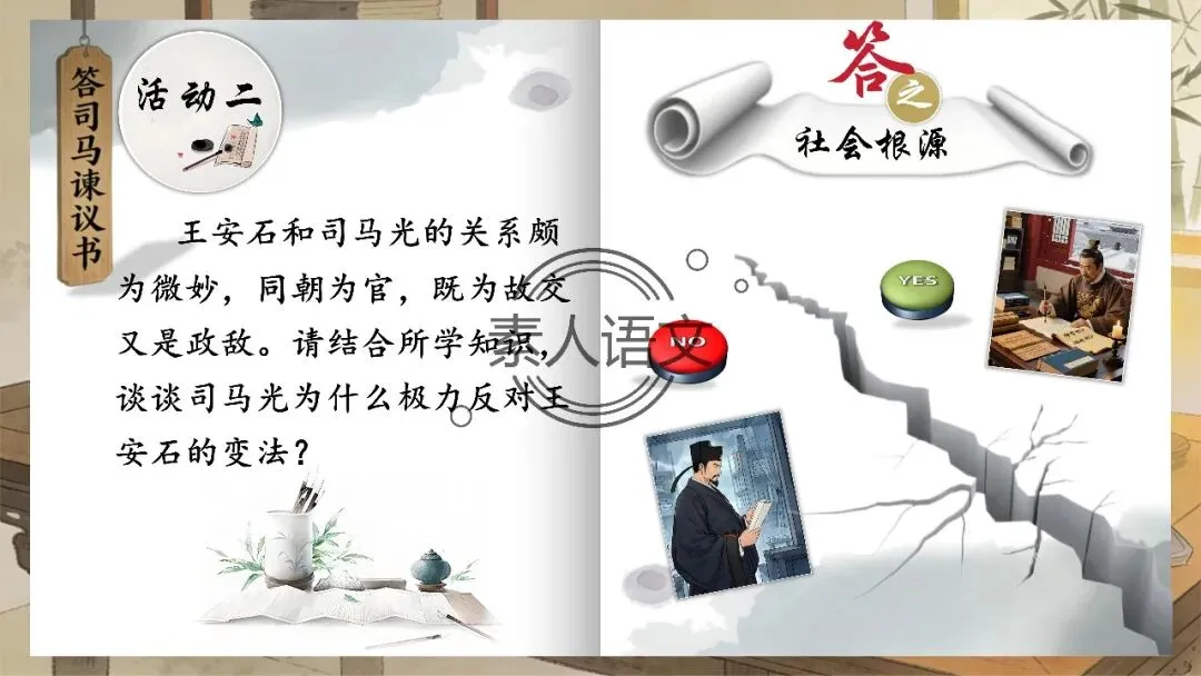小伙伴们好,今天推出的课件是《答司马谏议书》。本课进行的是常态课设计,分三个部分进行教学,共设计五个活动。 活动一:细读文本,聚焦文章第2段,说说王安石具体回答了司马光什么内容?活动二:王安石和司马光的关系颇为微妙,同朝为官,既为故交又是政敌。请结合所学知识,谈谈司马光为什么极力反对王安石的变法? 活动三:细读文本,聚焦文章第3段,思考在“怨谤”汹汹然的情况下,王安石为什么还要坚持变法,这体现了他怎样的担当精神? 活动四: 《答司马谏议书》被称为古代驳论文的典范之作。请通读全文,聚焦相关细节,概括王安石回驳司马光的艺术技巧。