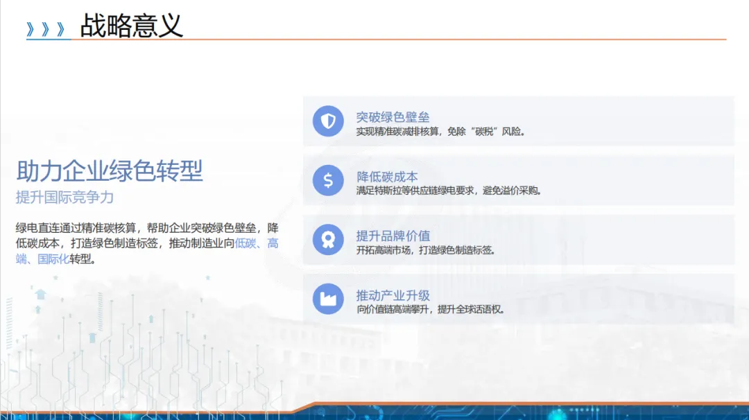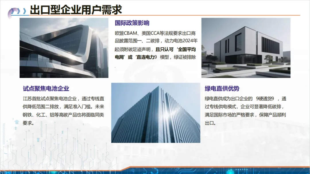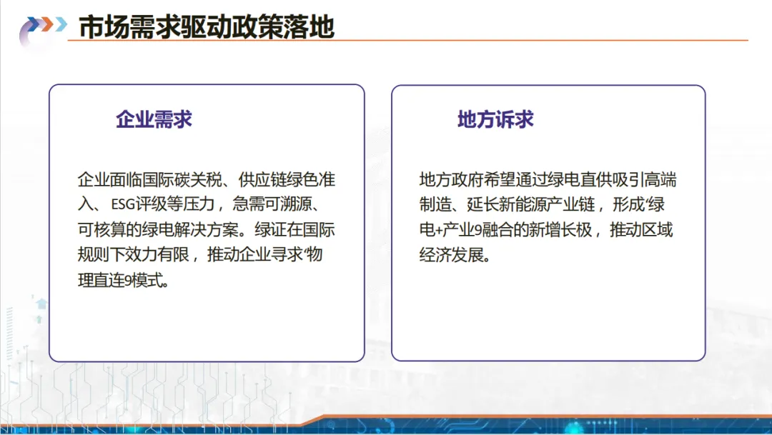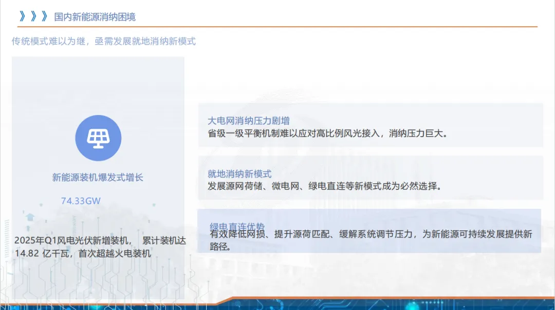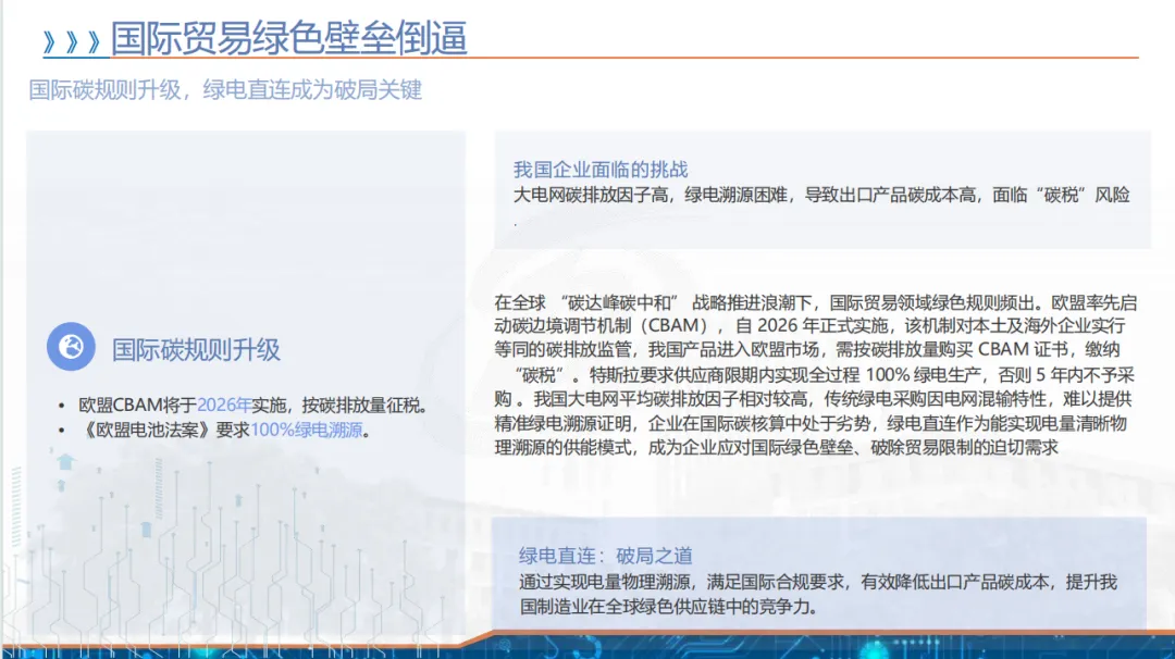 背景上,欧盟 CBAM 等国际碳规则落地,我国企业面临碳税风险,且新能源装机激增致大电网消纳压力大,绿电直连因可物理溯源、就地消纳成为破局关键,兼具降碳成本、提升国际竞争力的战略意义。