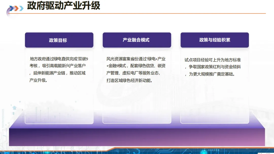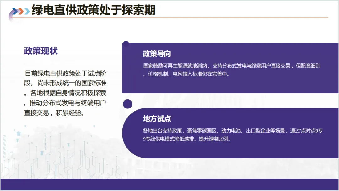 政策方面,国家 650 号文首次制度性认可绿电直连,明确并网 / 离网分类、自发自用比例(≥60%)等要求,各地也出台试点政策,差异化明确投资主体、消纳距离、储能配置等,但存在余电上网定价不一、专线成本高等痛点。