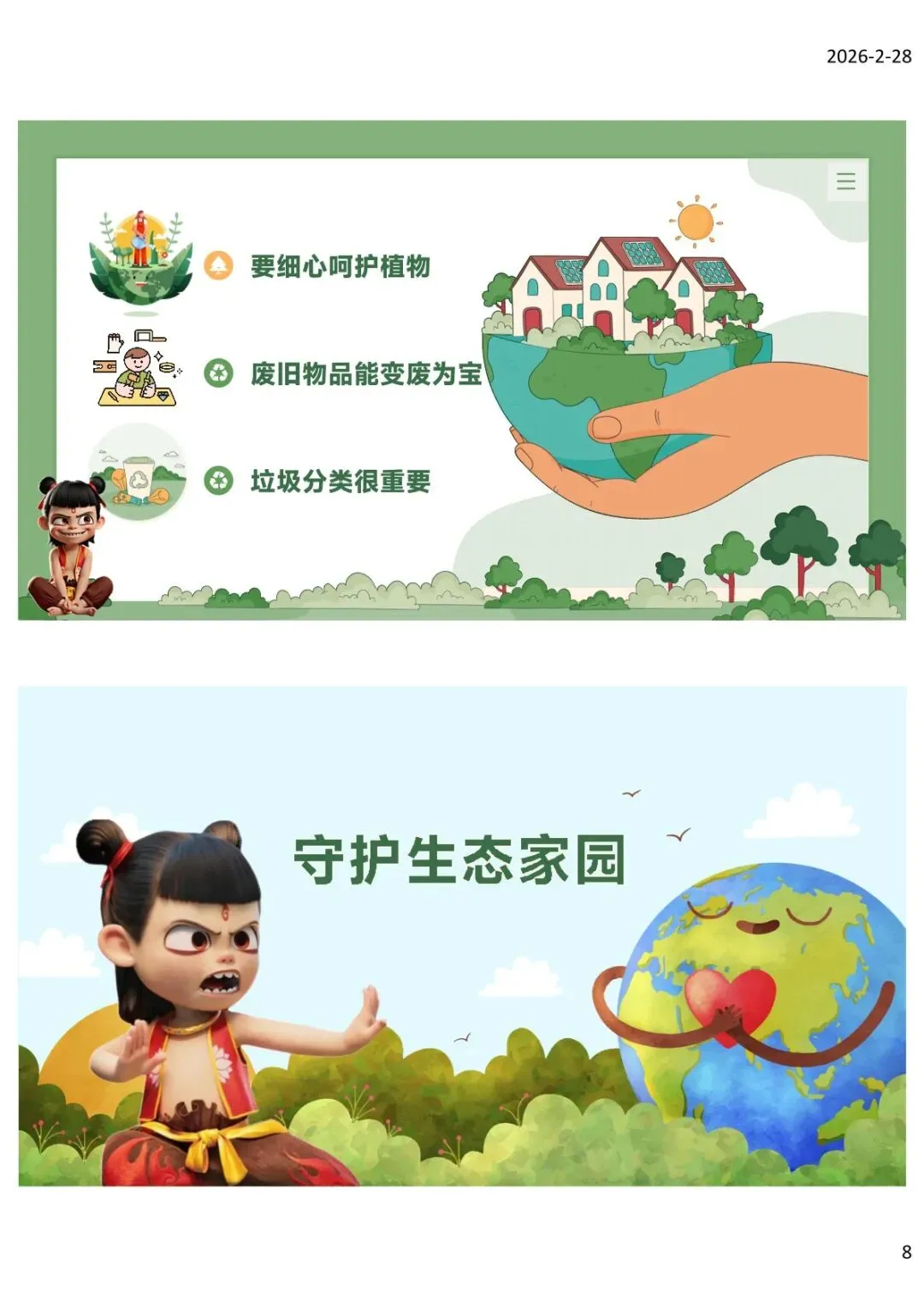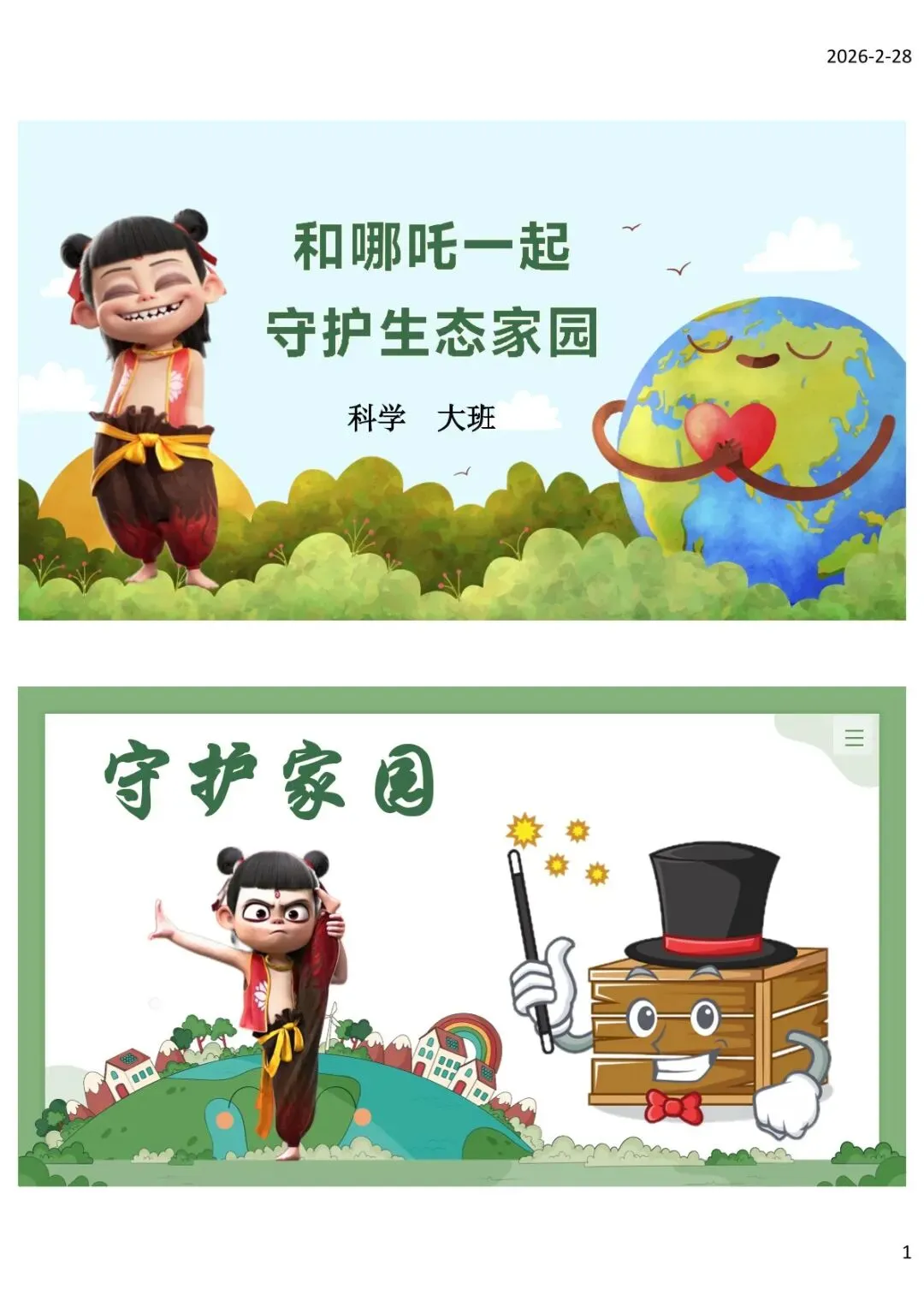 激发幼儿对自然的热爱与保护意识,培养珍惜资源、爱护环境的科学态度;鼓励幼儿像哪吒一样勇敢担当,积极参与垃圾分类、植物养护等环保行动,争做生态家园小卫士。