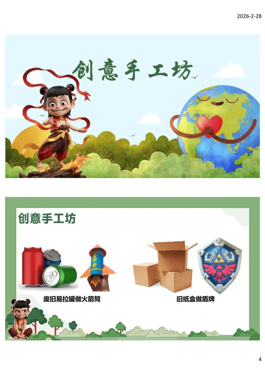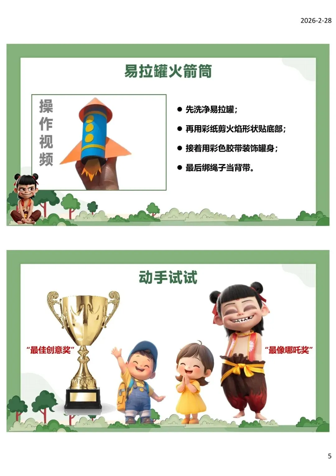 教师活动:举办一场“环保创意秀”,教师穿着哪吒服装,拿着用废旧易拉罐制作的“哪吒火箭筒”、用旧纸盒做的“哪吒盾牌”等手工艺品闪亮登场,伴随着动感的音乐,展示手工艺品的独特玩法,如发射“火箭筒”、用“盾牌”抵挡“攻击”,激发幼儿的制作欲望。教师详细讲解制作步骤,如制作易拉罐火箭筒时,先把易拉罐清洗干净,用彩纸剪出火焰形状贴在易拉罐底部当作火箭的火焰,再用彩色胶带装饰筒身,最后用绳子绑在手上。鼓励幼儿发挥想象,制作属于自己的“环保武器”,并设置“最佳创意奖”“最像哪吒奖”等多个奖项。