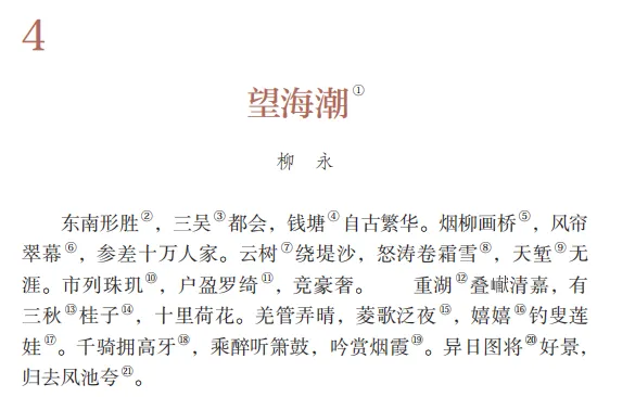 (4)“重湖叠巘清嘉,有三秋桂子,十里荷花。”——湖山的美好。“三秋桂子”照应“叠巘”,“十里荷花”照应“重湖”。进一步描写“东南形胜”。
