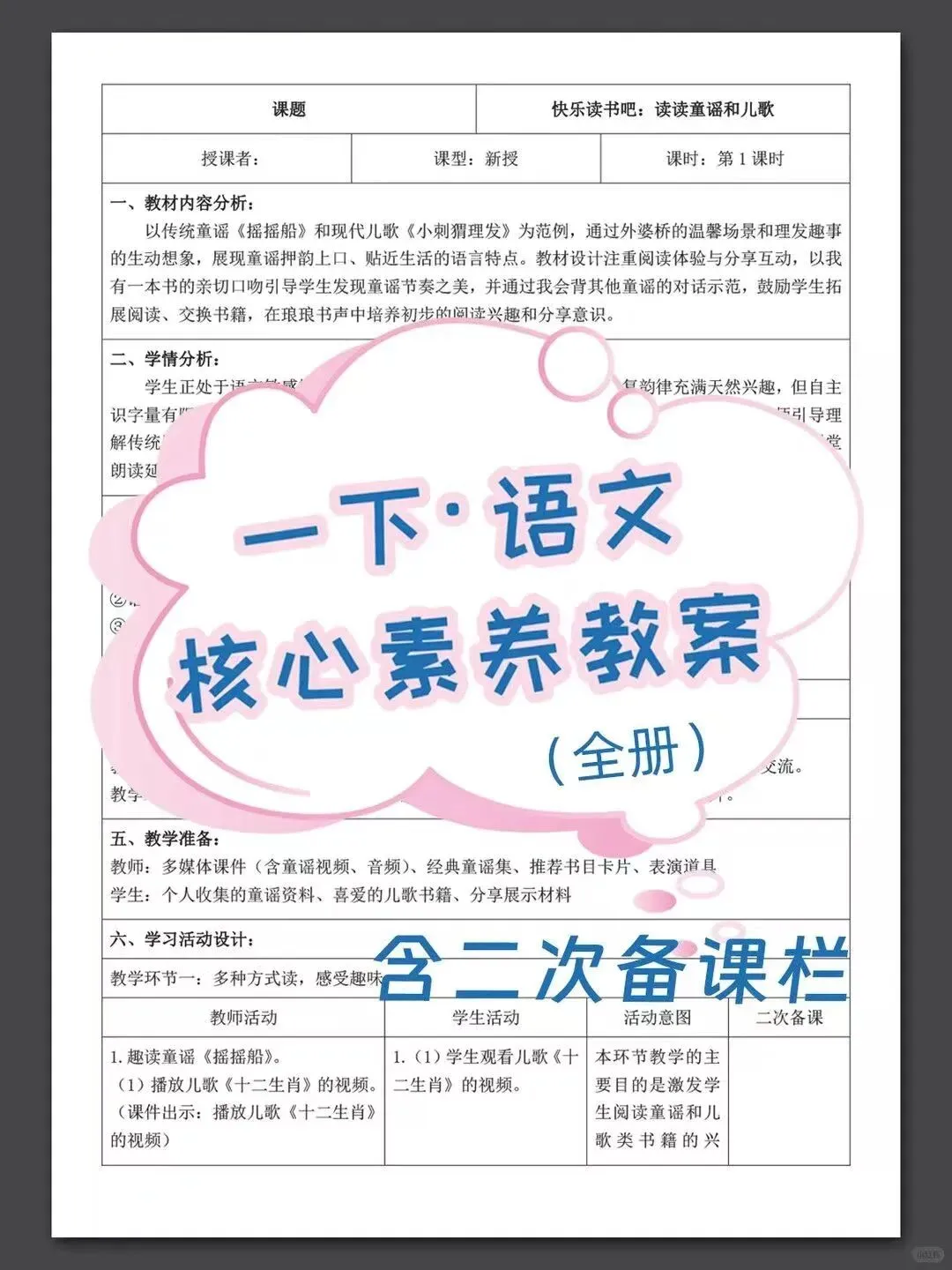 2026新版一年级核心素养教案师生活动带二次备课表格版