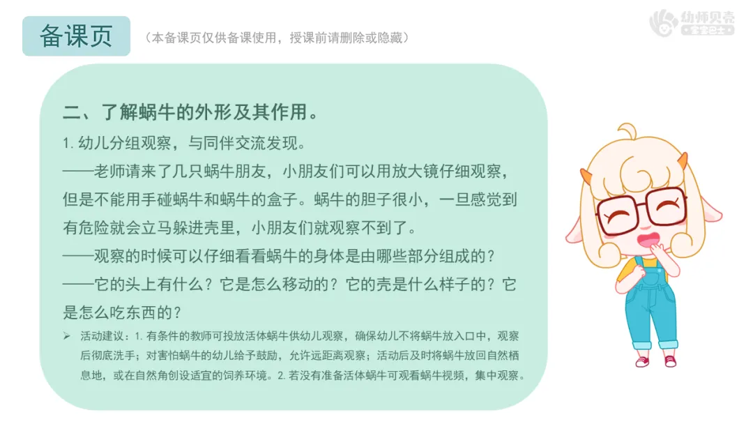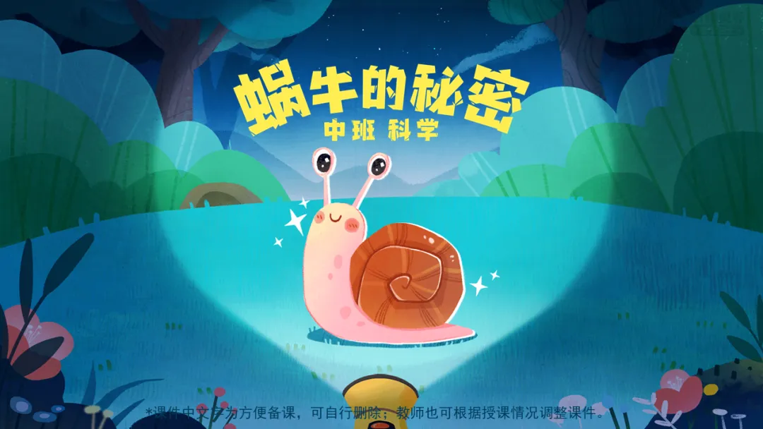 Ø活动建议:1.有条件的教师可投放活体蜗牛供幼儿观察,确保幼儿不将蜗牛放入口中,观察后彻底洗手;对害怕蜗牛的幼儿给予鼓励,允许远距离观察;活动后及时将蜗牛放回自然栖息地,或在自然角创设适宜的饲养环境。2.若没有准备活体蜗牛可观看蜗牛视频,集中观察。