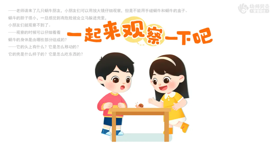 l重点:尝试用工具对蜗牛进行简单观察,能用语言描述蜗牛的特点,萌发探究蜗牛的兴趣。