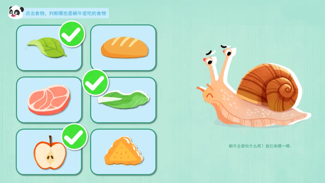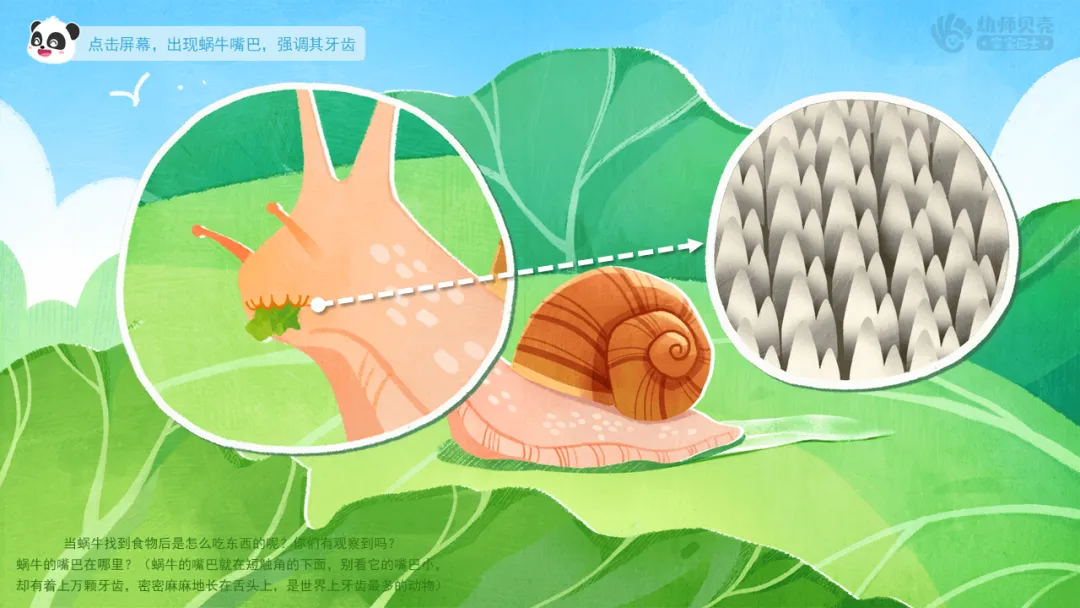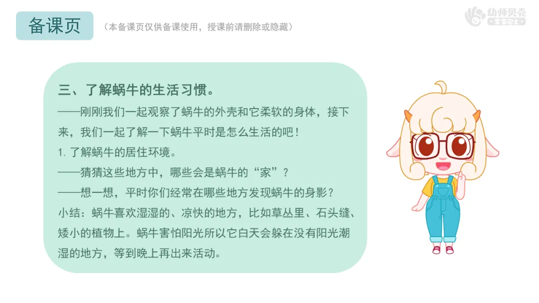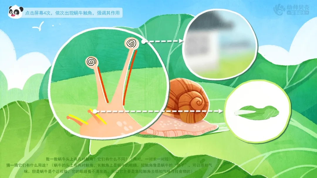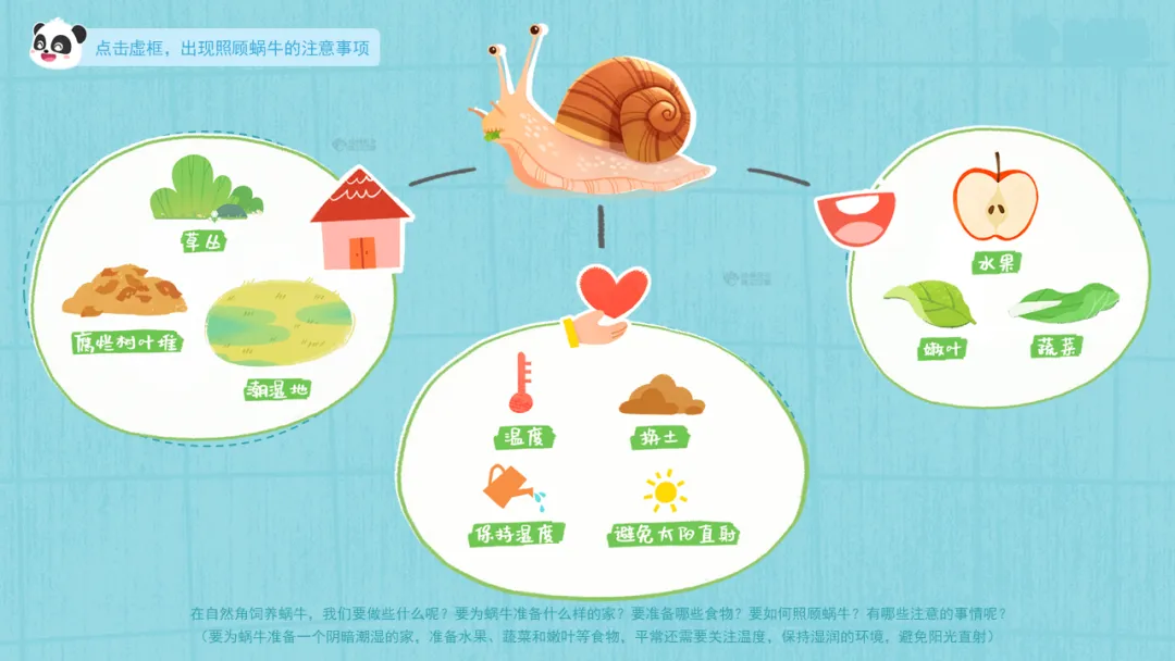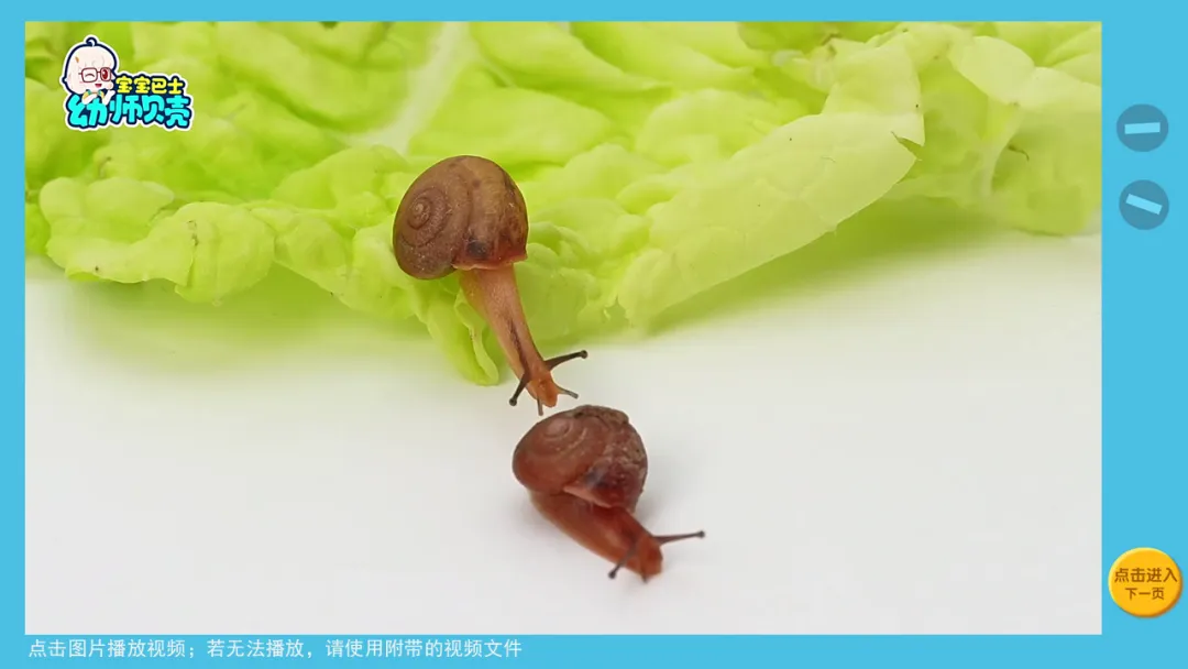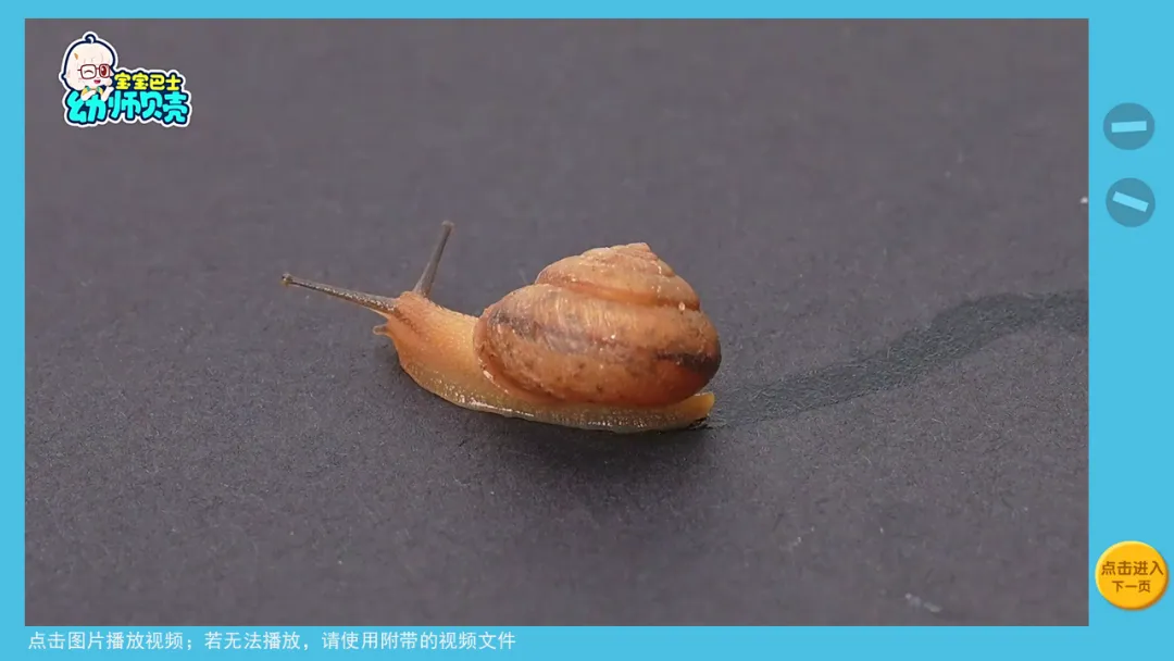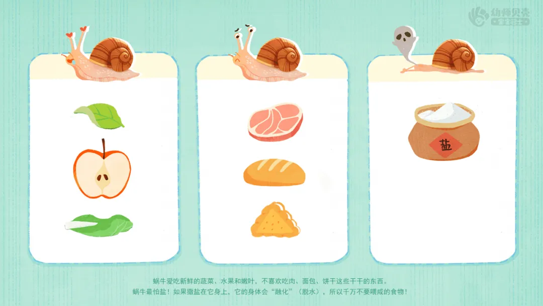 ——刚刚我们一起观察了蜗牛的外壳和它柔软的身体,接下来,我们一起了解一下蜗牛平时是怎么生活的吧!