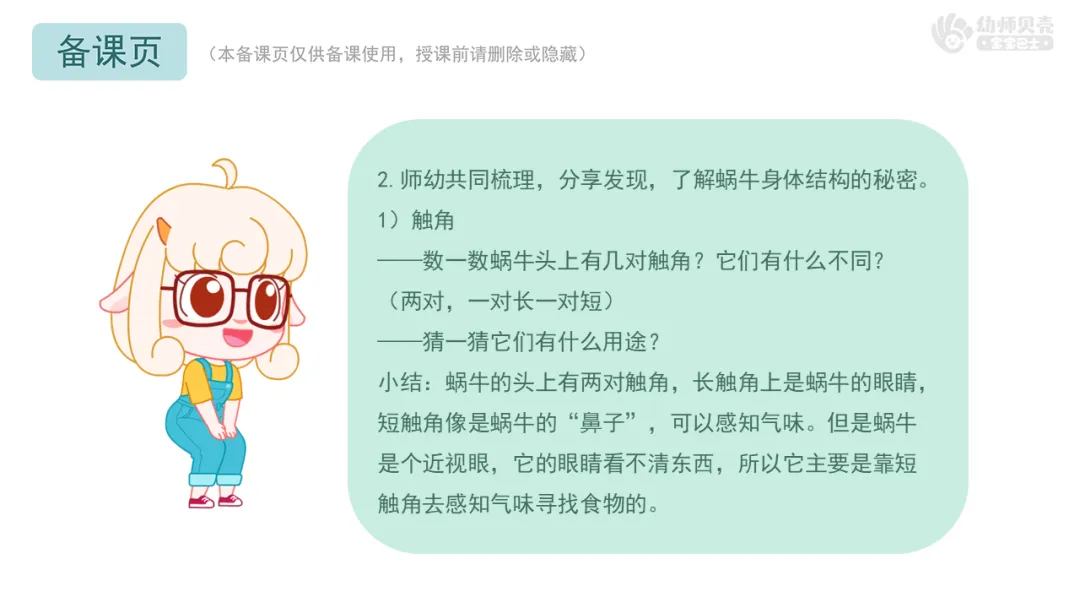 2.师幼共同梳理,分享发现,了解蜗牛身体结构的秘密。