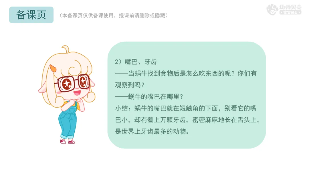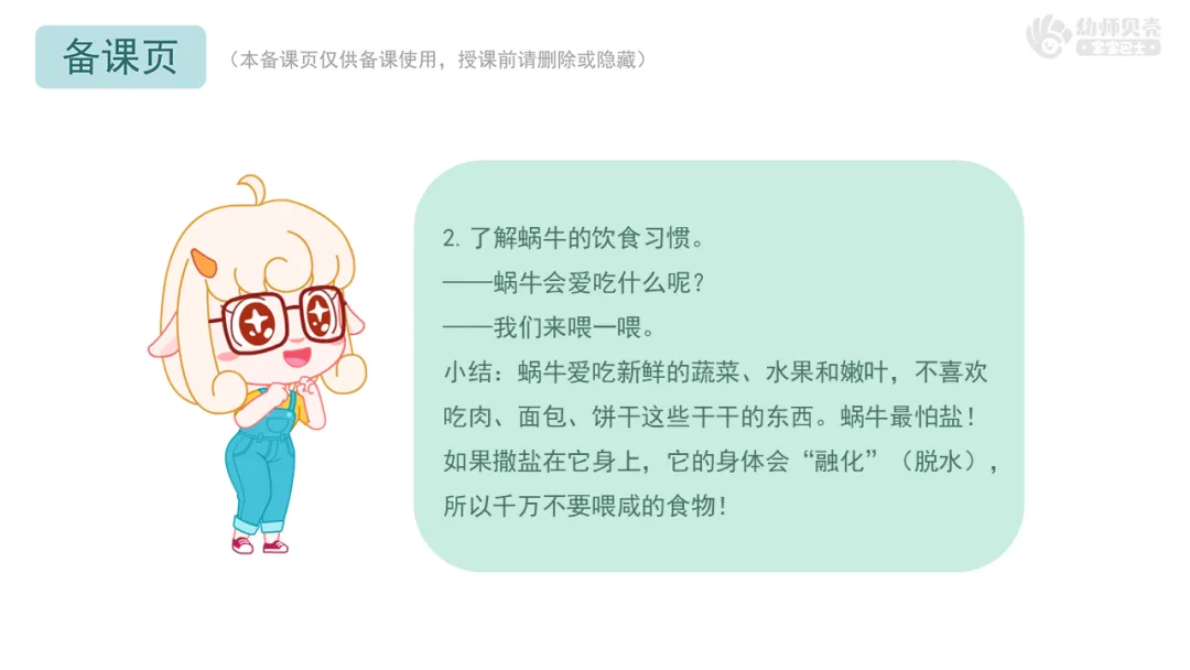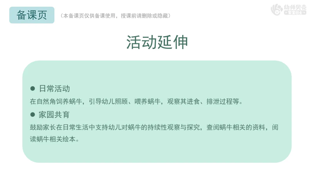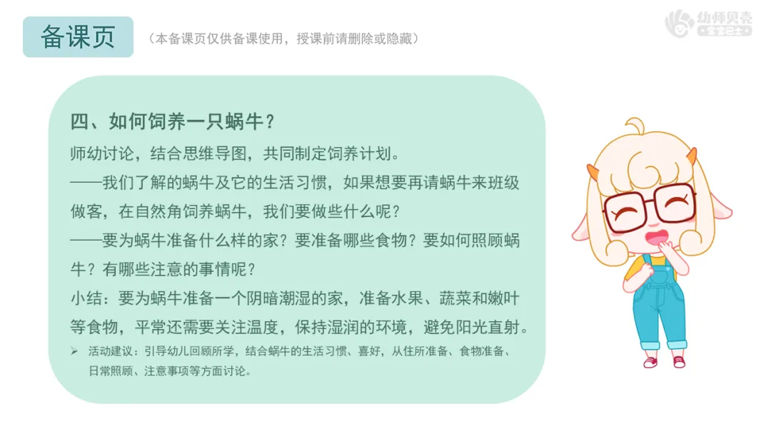 Ø活动建议:引导幼儿回顾所学,结合蜗牛的生活习惯、喜好,从住所准备、食物准备、日常照顾、注意事项等方面讨论。
