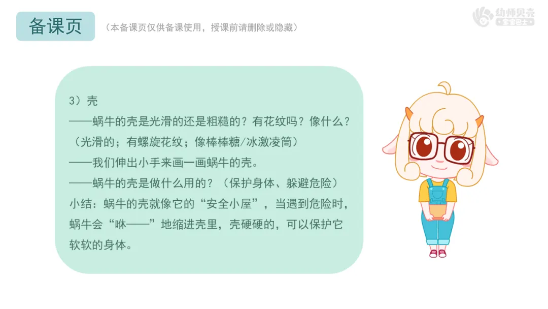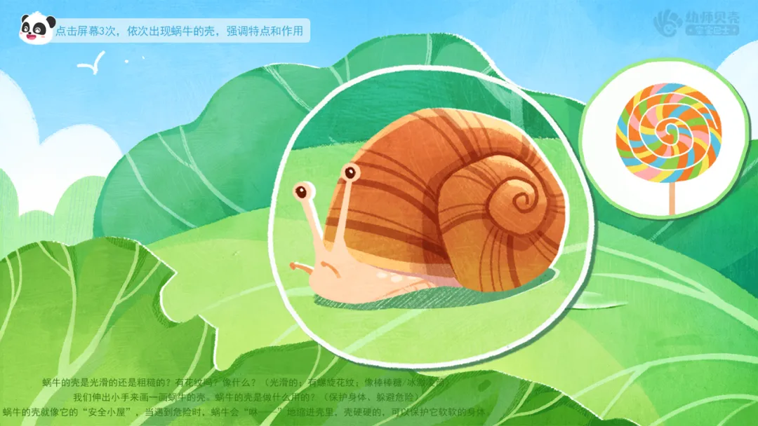 ——蜗牛的壳是光滑的还是粗糙的?有花纹吗?像什么?(光滑的;有螺旋花纹;像棒棒糖/冰激凌筒)