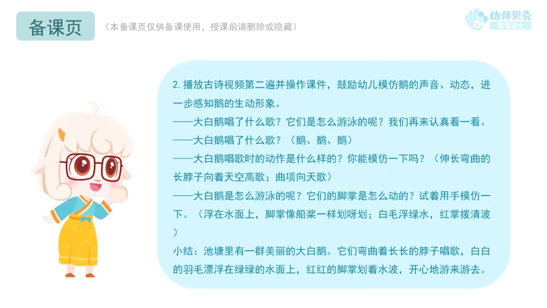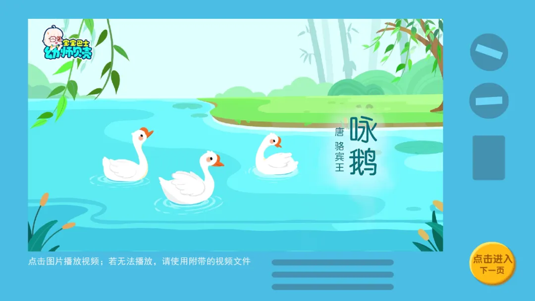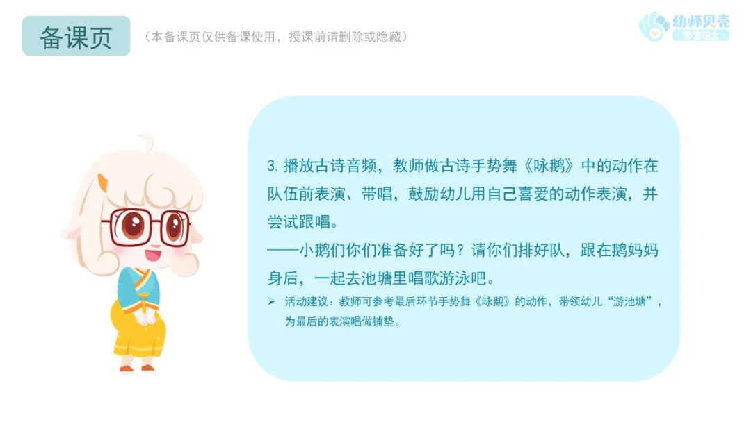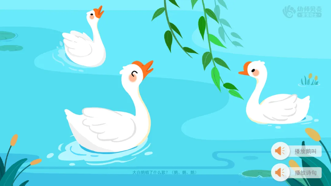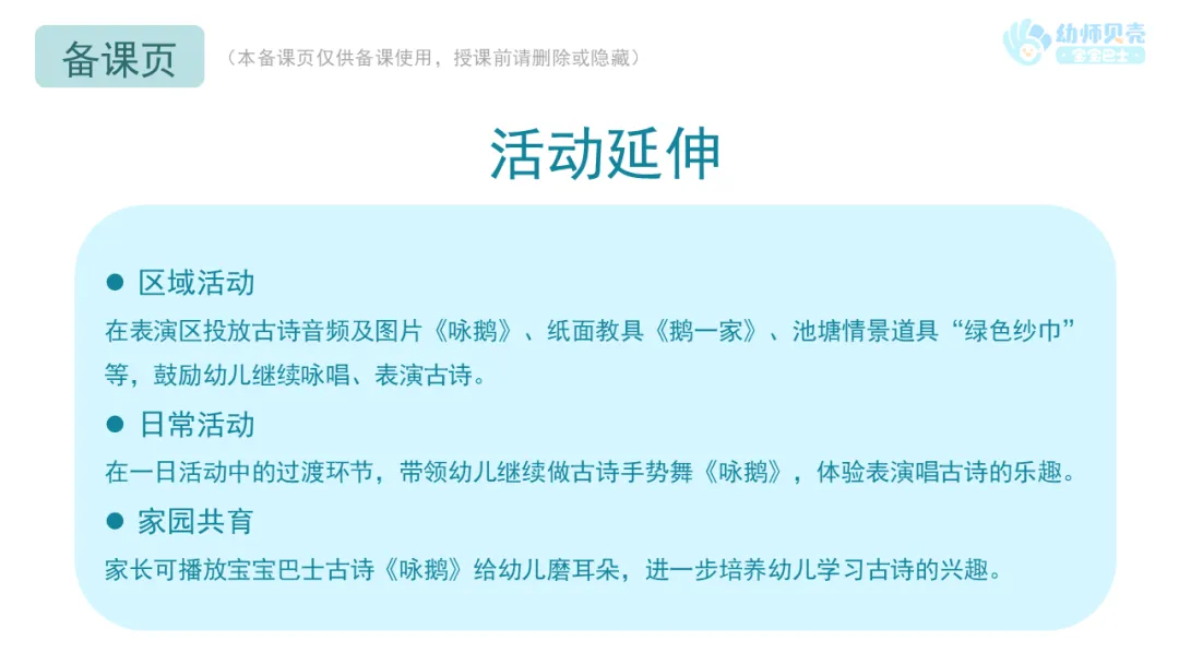 2.教师可在一日活动中播放古诗音频《咏鹅》,供幼儿磨耳朵。