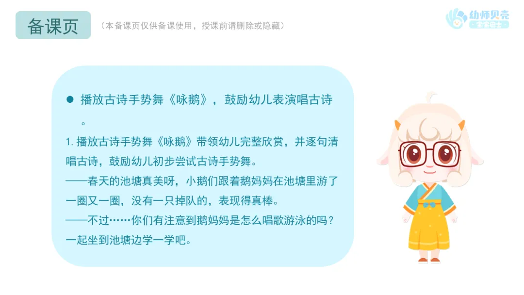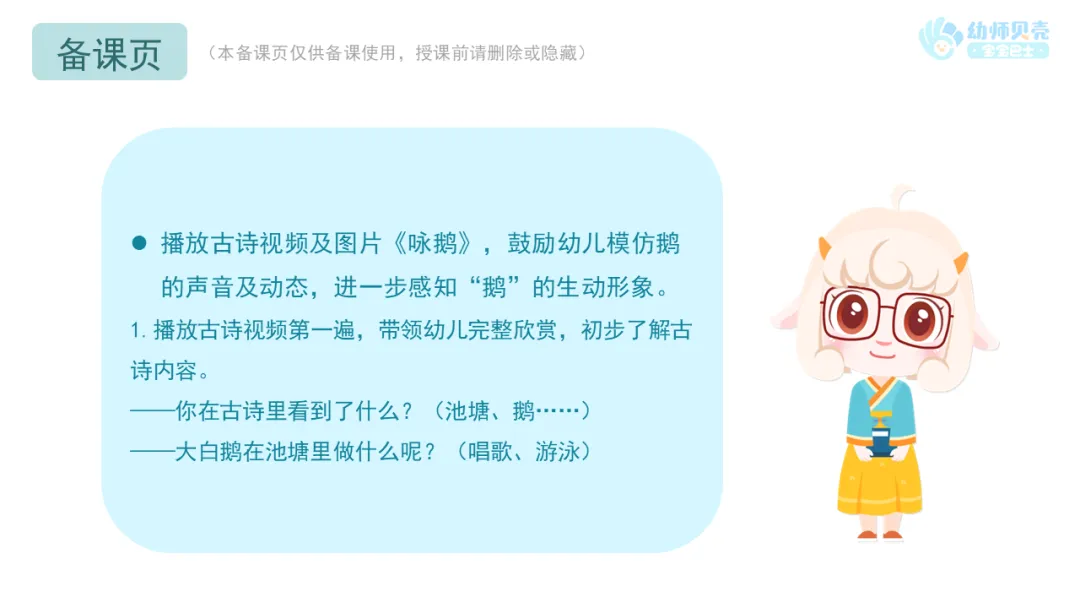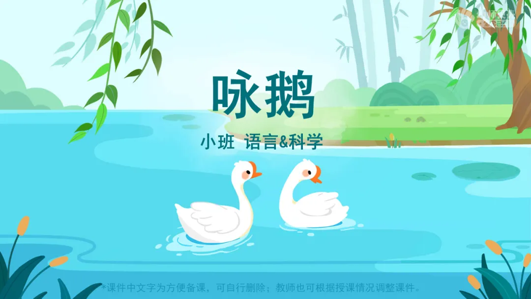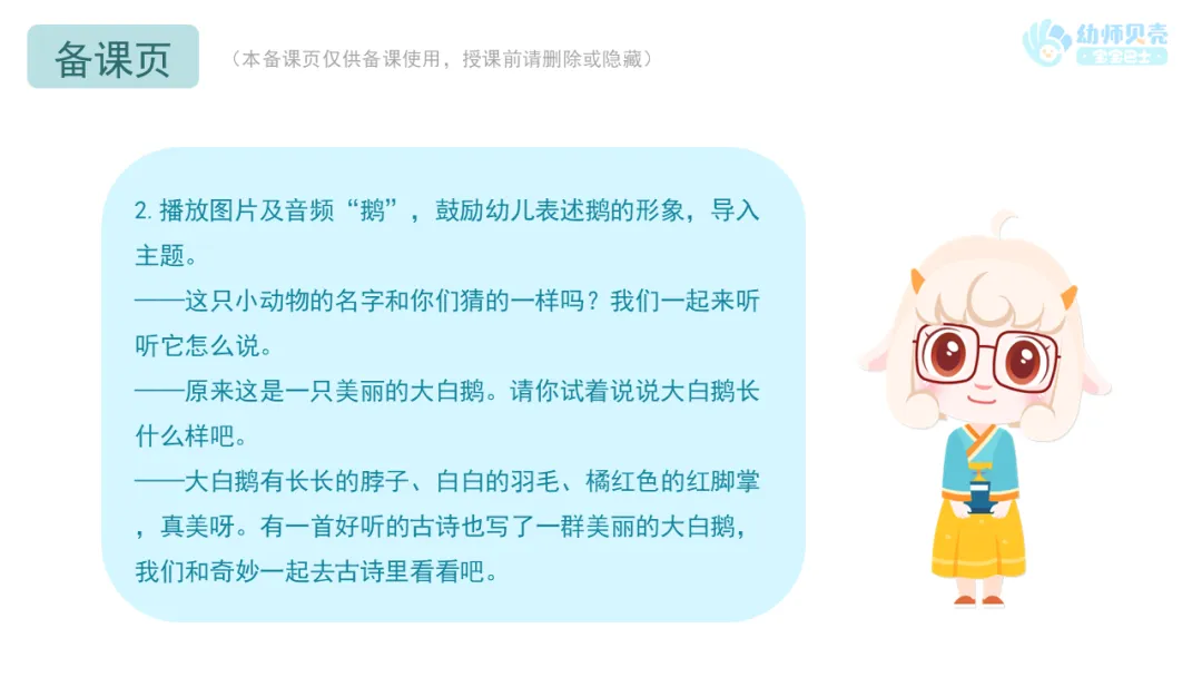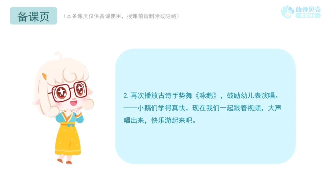 2.教师可在一日活动中播放古诗音频《咏鹅》,供幼儿磨耳朵。
