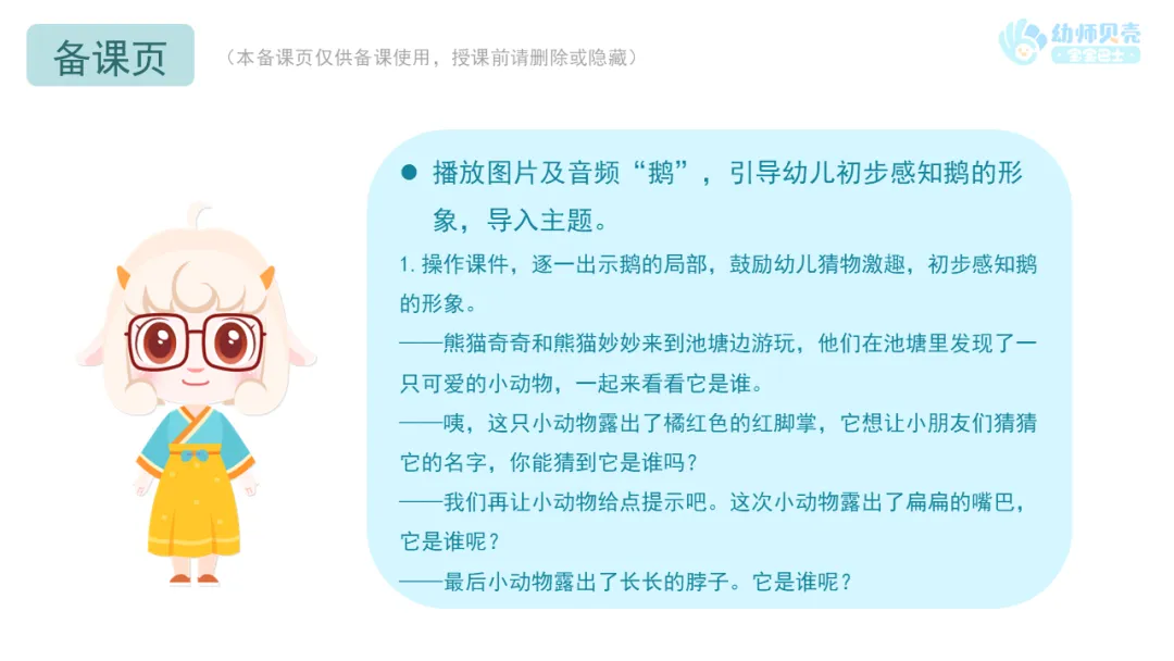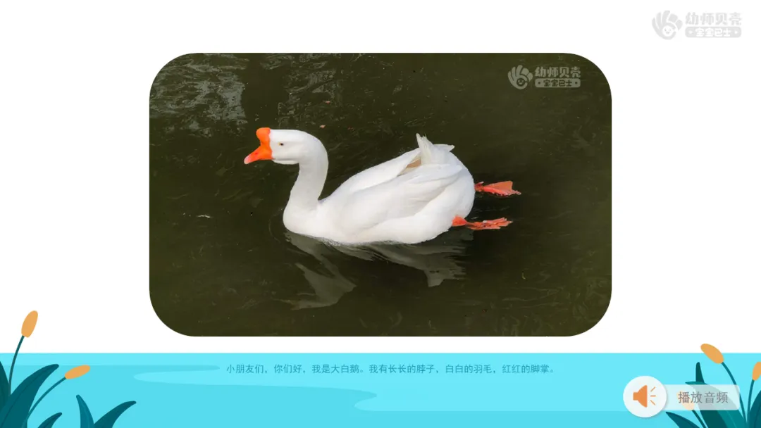 l播放图片及音频“鹅”,引导幼儿初步感知鹅的形象,导入主题。