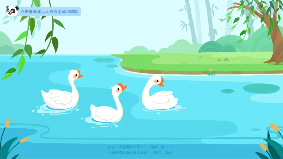 ——大白鹅唱了什么歌?它们是怎么游泳的呢?我们再来认真看一看。