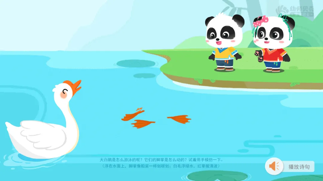 ——大白鹅是怎么游泳的呢?它们的脚掌是怎么动的?试着用手模仿一下。(浮在水面上,脚掌像船桨一样划呀划;白毛浮绿水,红掌拨清波)
