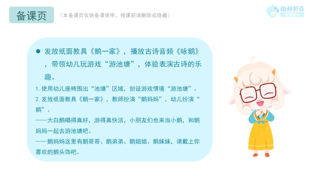 l发放纸面教具《鹅一家》,播放古诗音频《咏鹅》,带领幼儿玩游戏“游池塘”,体验表演古诗的乐趣。
