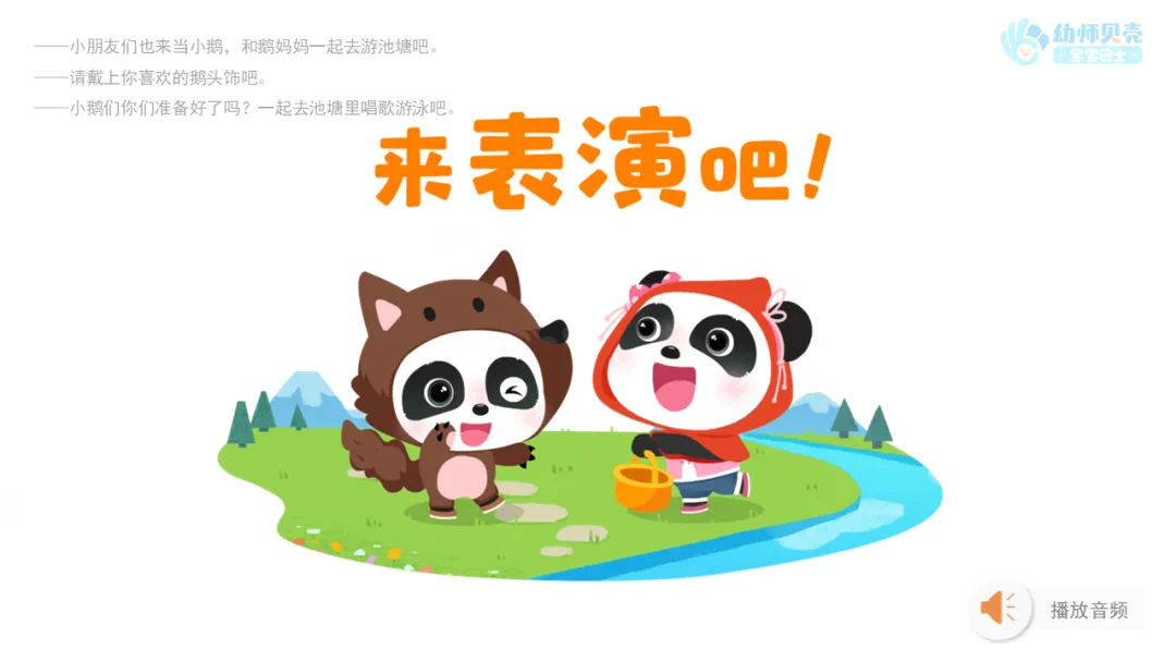 ——小鹅们你们准备好了吗?请你们排好队,跟在鹅妈妈身后,一起去池塘里唱歌游泳吧。