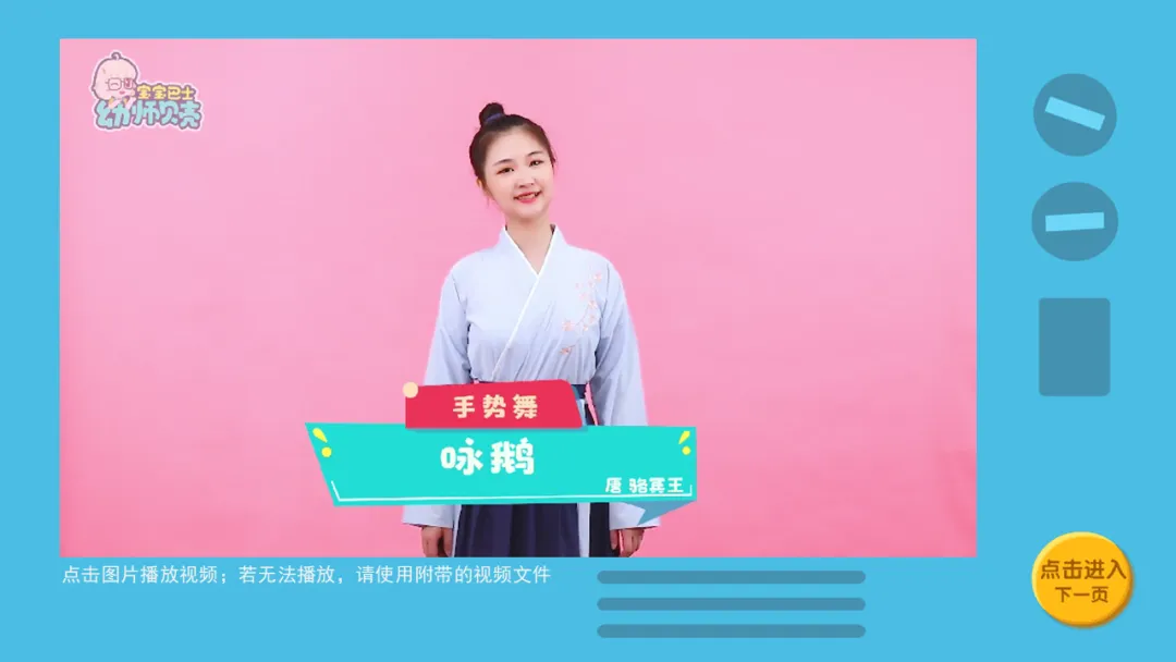l课件准备:《咏鹅》古诗视频及图片;《咏鹅》古诗手势舞;《咏鹅》古诗音频。