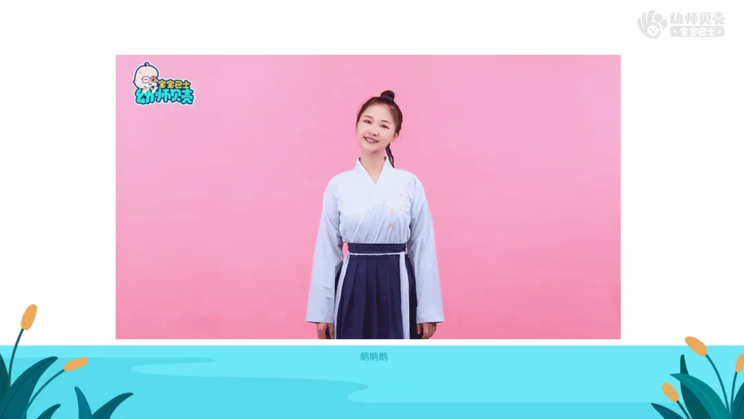l播放古诗视频及图片《咏鹅》,鼓励幼儿模仿鹅的声音及动态,进一步感知“鹅”的生动形象。