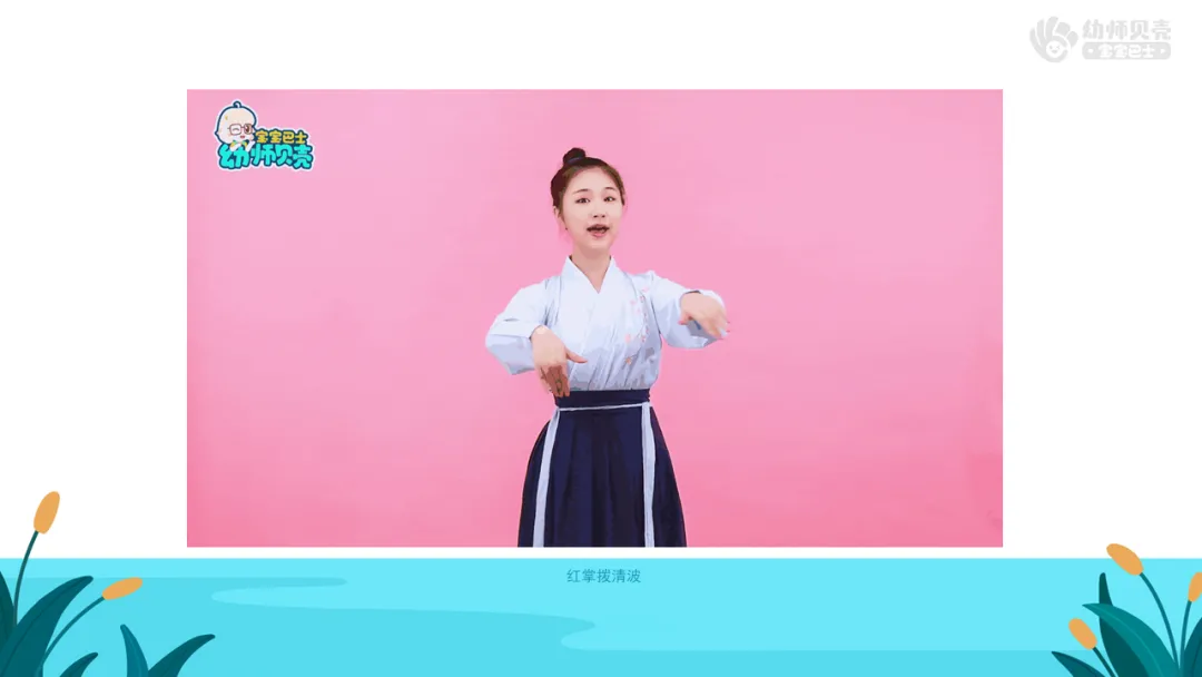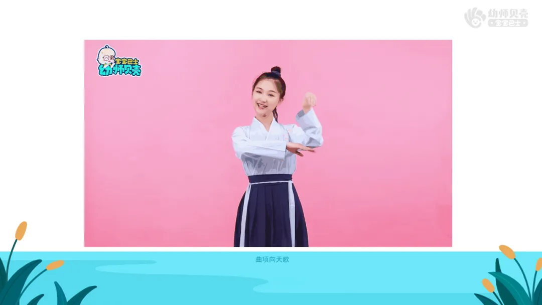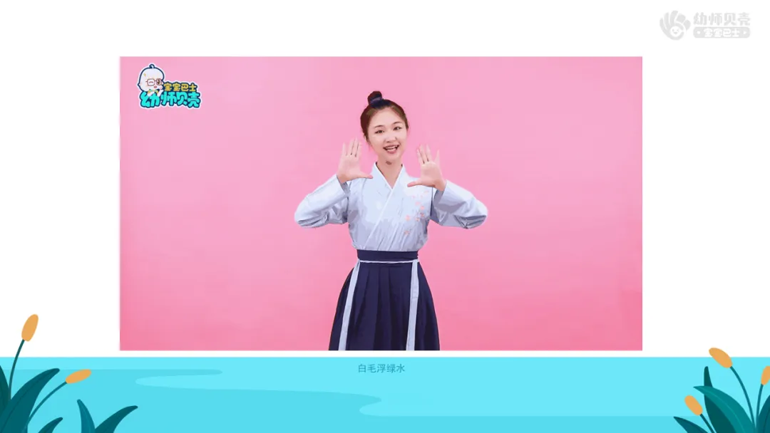 Ø活动建议:教师可参考最后环节手势舞《咏鹅》的动作,带领幼儿“游池塘”,为最后的表演唱做铺垫。