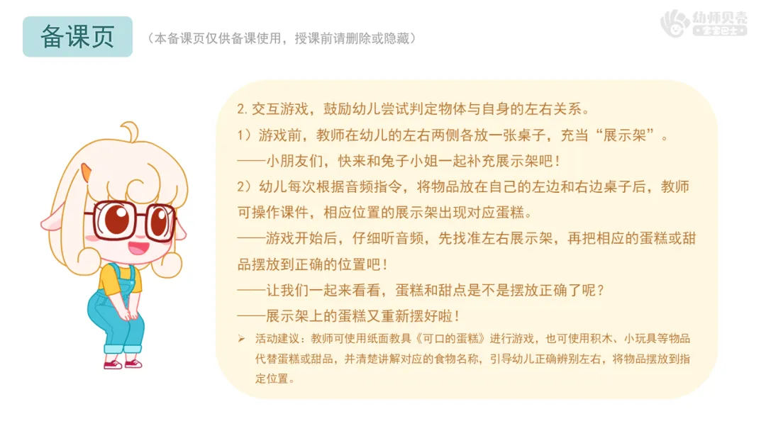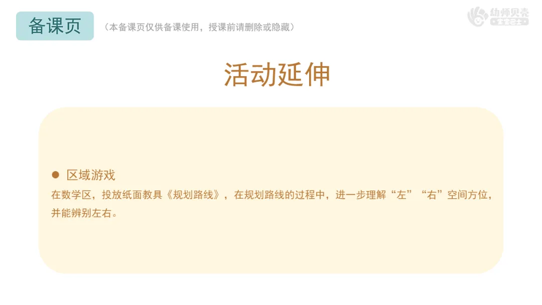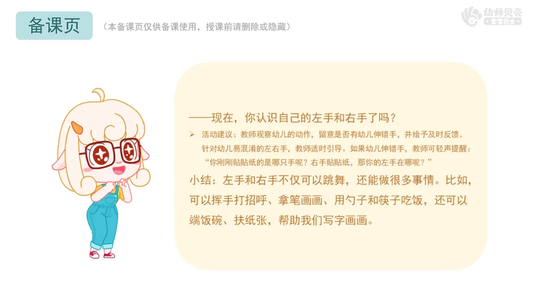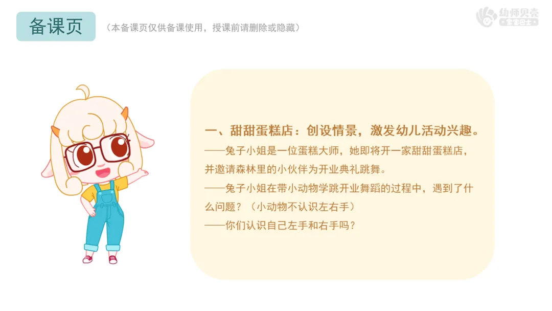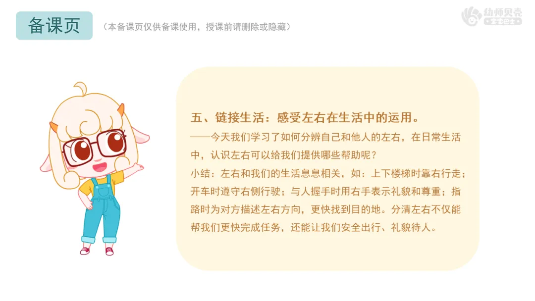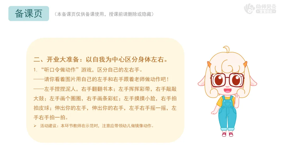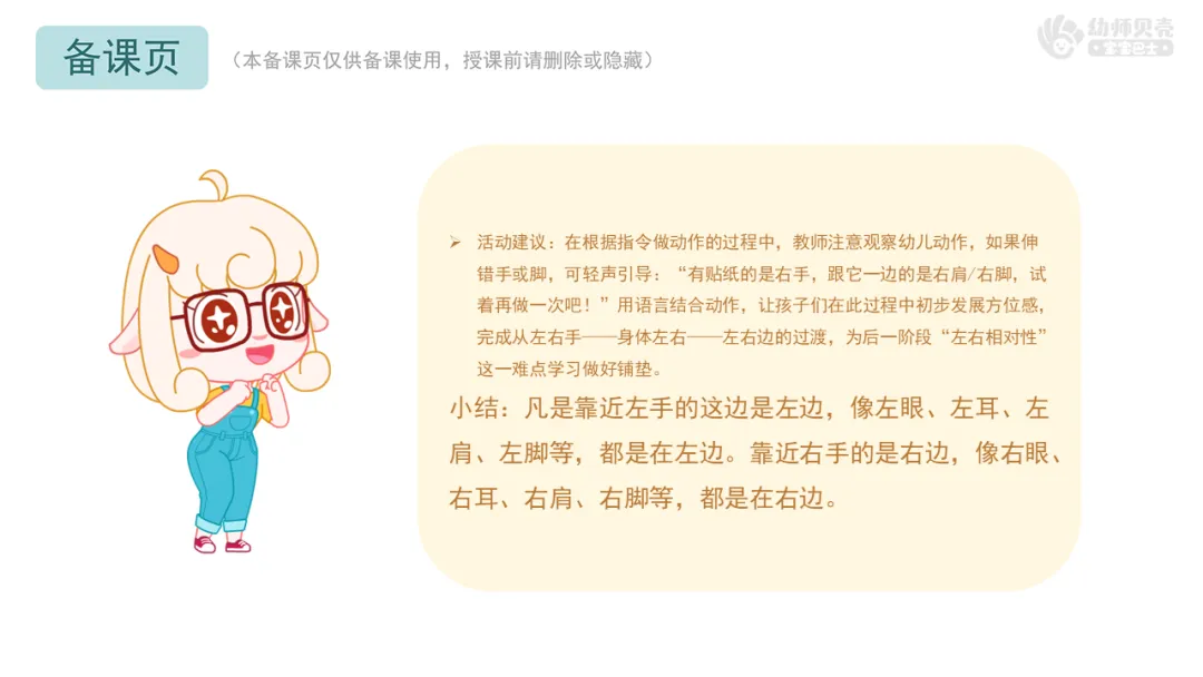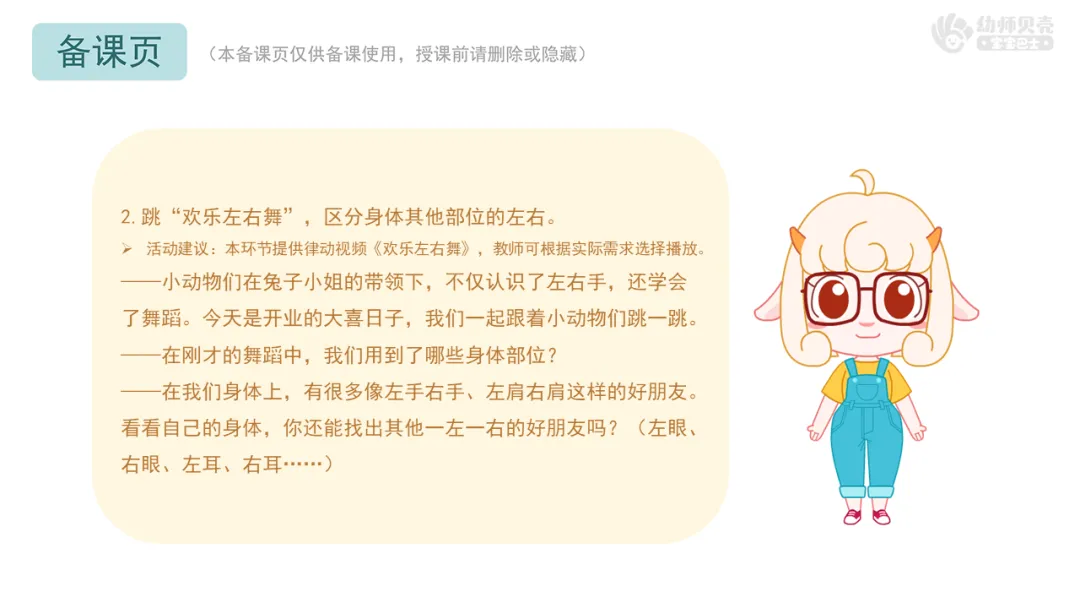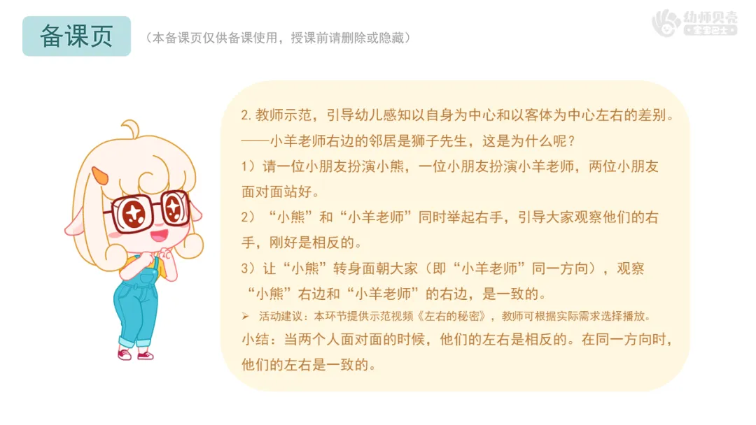 Ø活动建议:本环节提供示范视频《左右的秘密》,教师可根据实际需求选择播放。