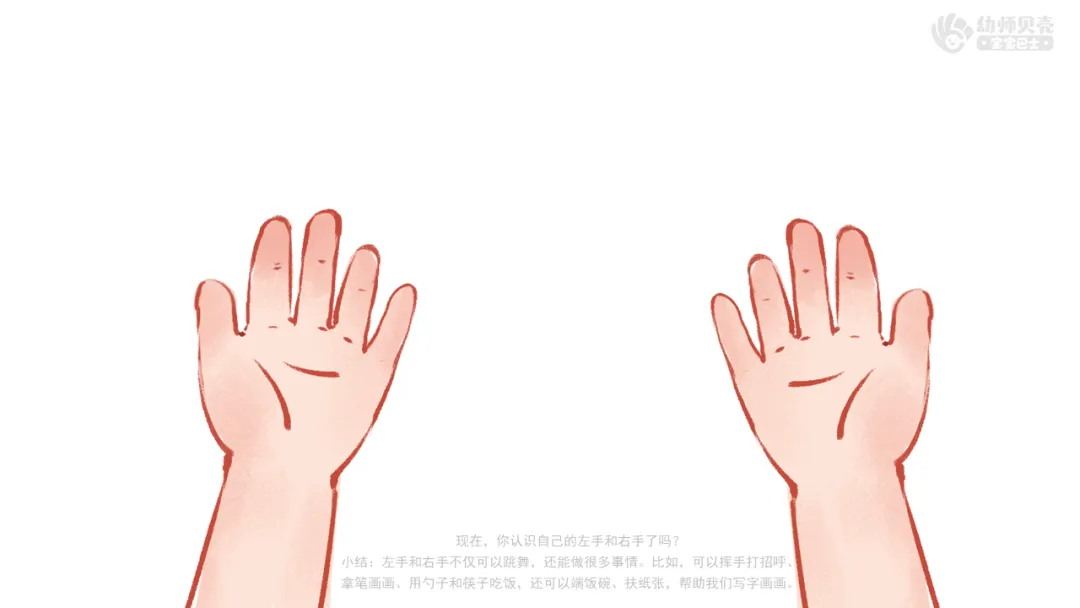 小结:左手和右手不仅可以跳舞,还能做很多事情。比如,可以挥手打招呼、拿笔画画、用勺子和筷子吃饭,还可以端饭碗、扶纸张,帮助我们写字画画。