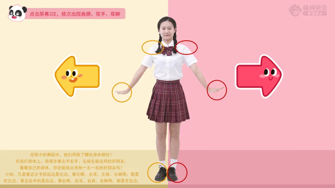 它一边的是右肩/右脚,试着再做一次吧!”用语言结合动作,让孩子们在此过程中初步发展方位感,完成从左右手——身体左右——左右边的过渡,为后一阶段“左右相对性”这一难点学习做好铺垫。