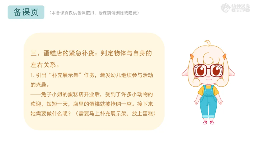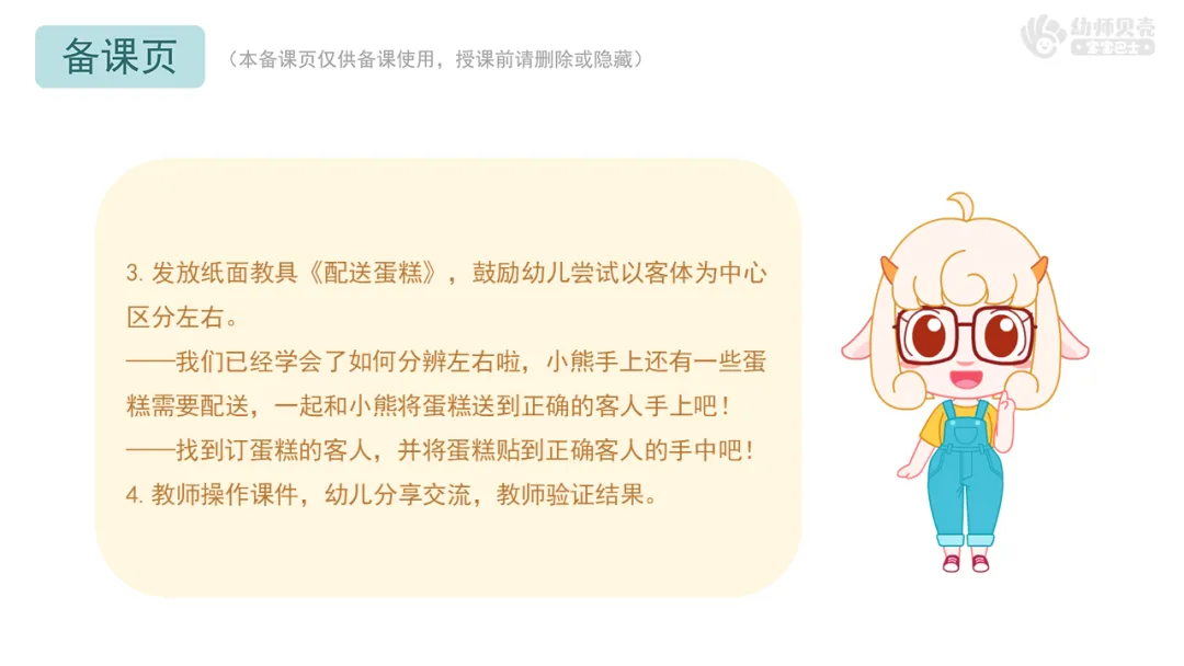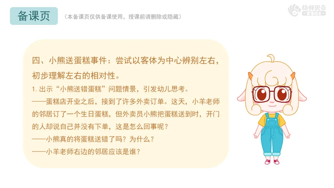 四、小熊送蛋糕事件:尝试以客体为中心辨别左右,初步理解左右的相对性。