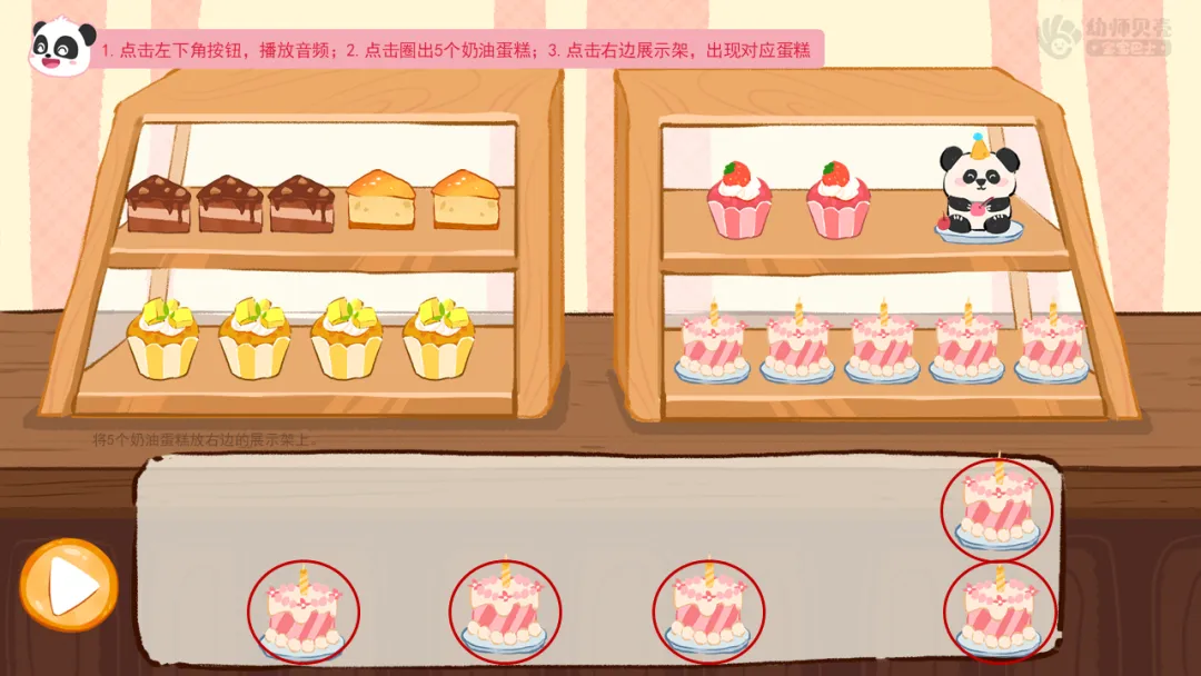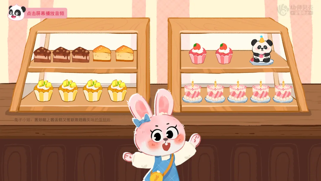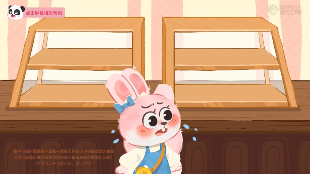 ——兔子小姐的蛋糕店开业后,受到了许多小动物的欢迎,短短一天,店里的蛋糕就被抢购一空。接下来她需要做什么呢?(需要马上补充展示架,放上蛋糕)