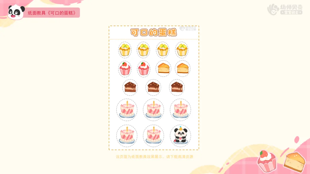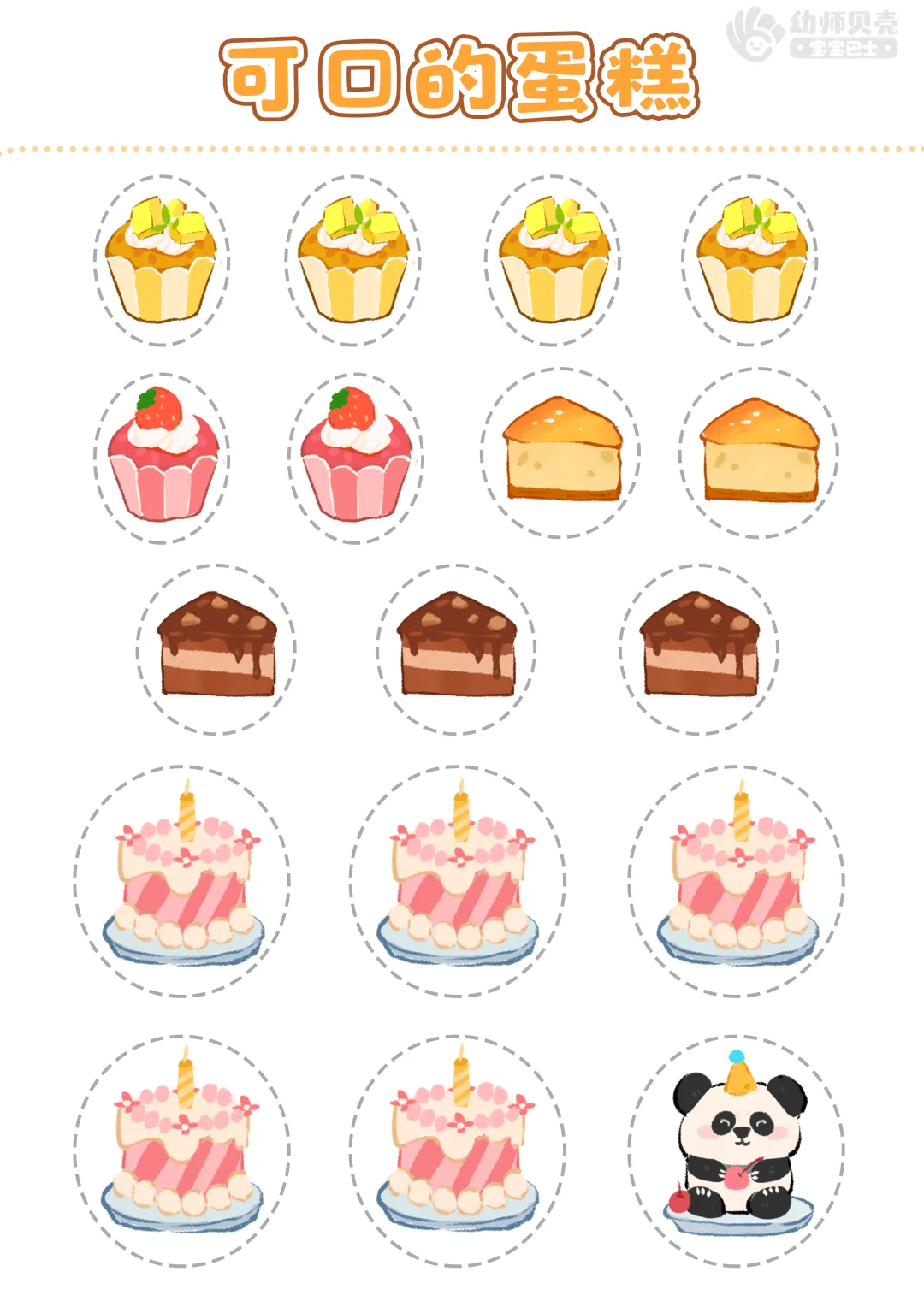 Ø活动建议:教师可使用纸面教具《可口的蛋糕》进行游戏,也可使用积木、小玩具等物品代替蛋糕或甜品,并清楚讲解对