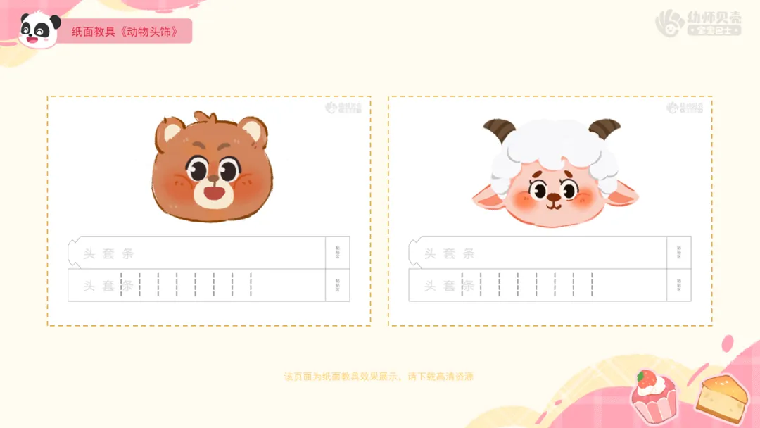 l纸面教具:《可口的蛋糕》《动物头饰》《配送蛋糕》。