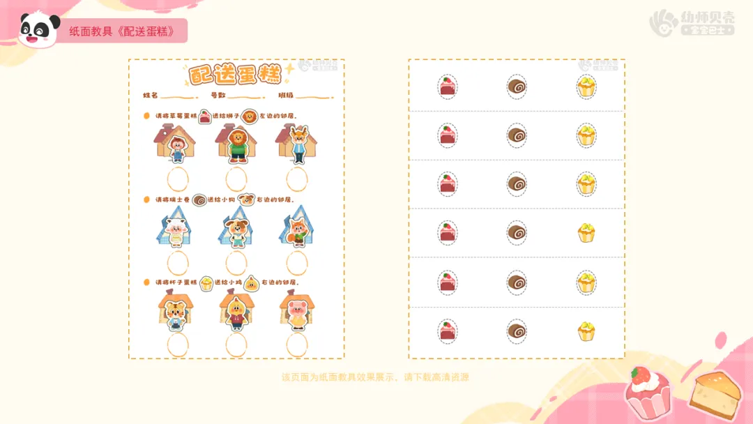 3.发放纸面教具《配送蛋糕》,鼓励幼儿尝试以客体为中心区分左右。