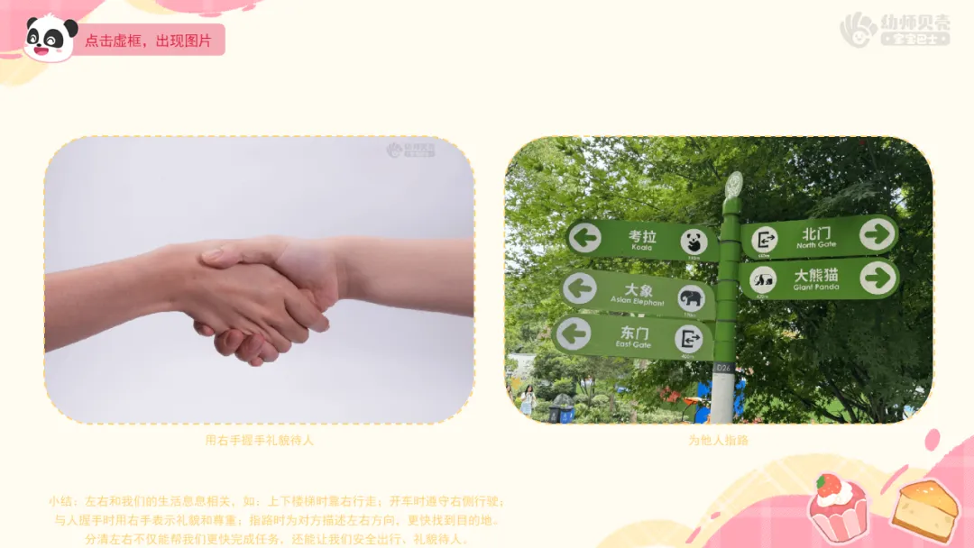 小结:左右和我们的生活息息相关,如:上下楼梯时靠右行走;开车时遵守右侧行驶;与人握手时用右手表示礼貌和尊重;指路时为对方描述左右方向,更快找到目的地。分清左右不仅能帮我们更快完成任务,还能让我们安全出行、礼貌待人。