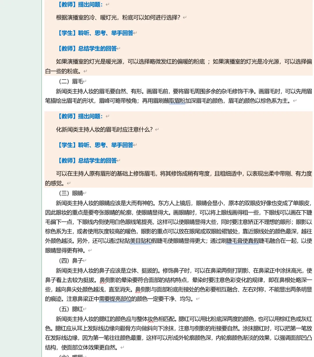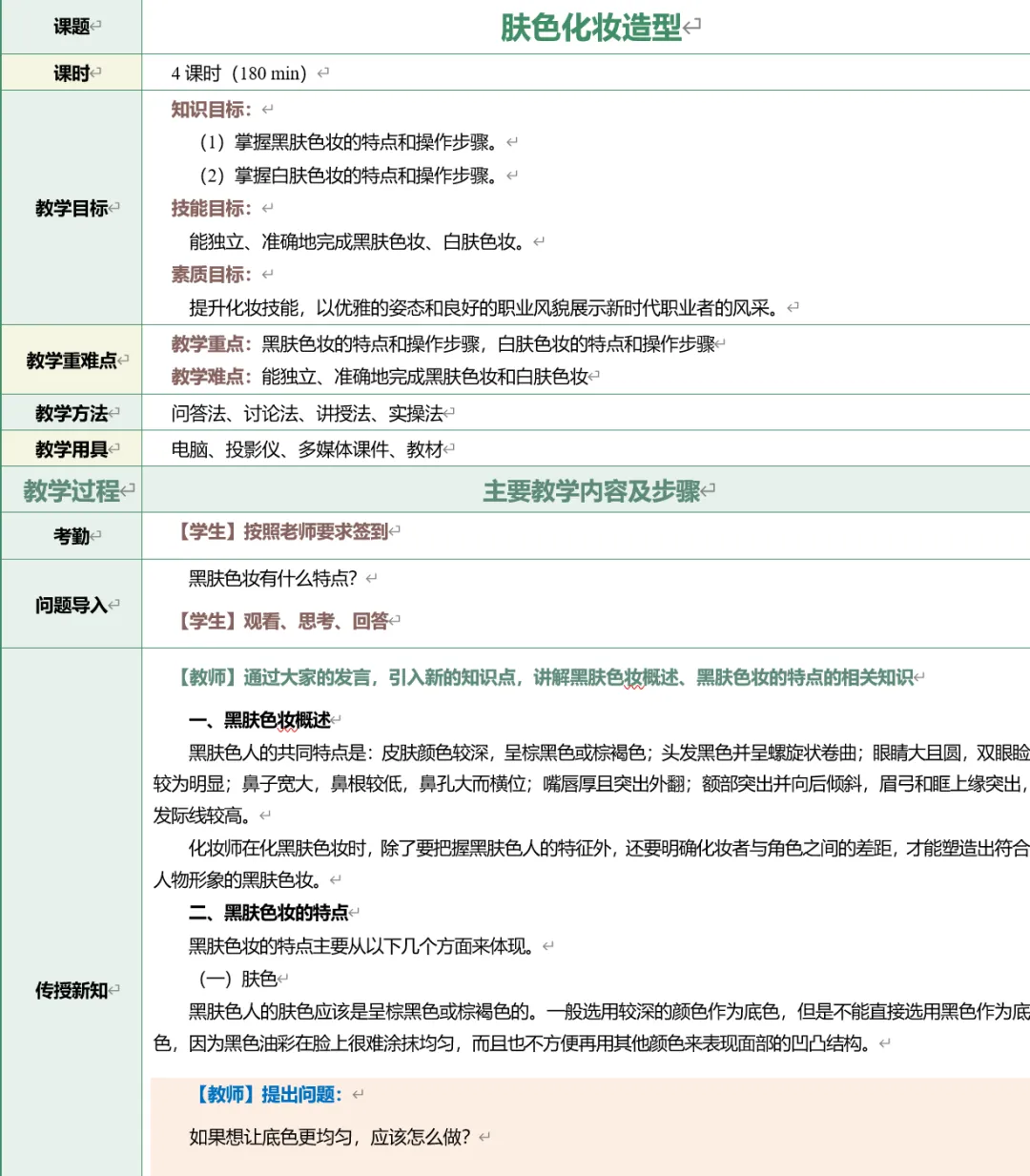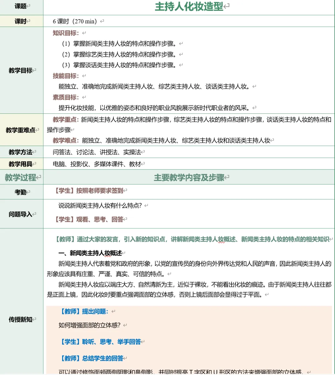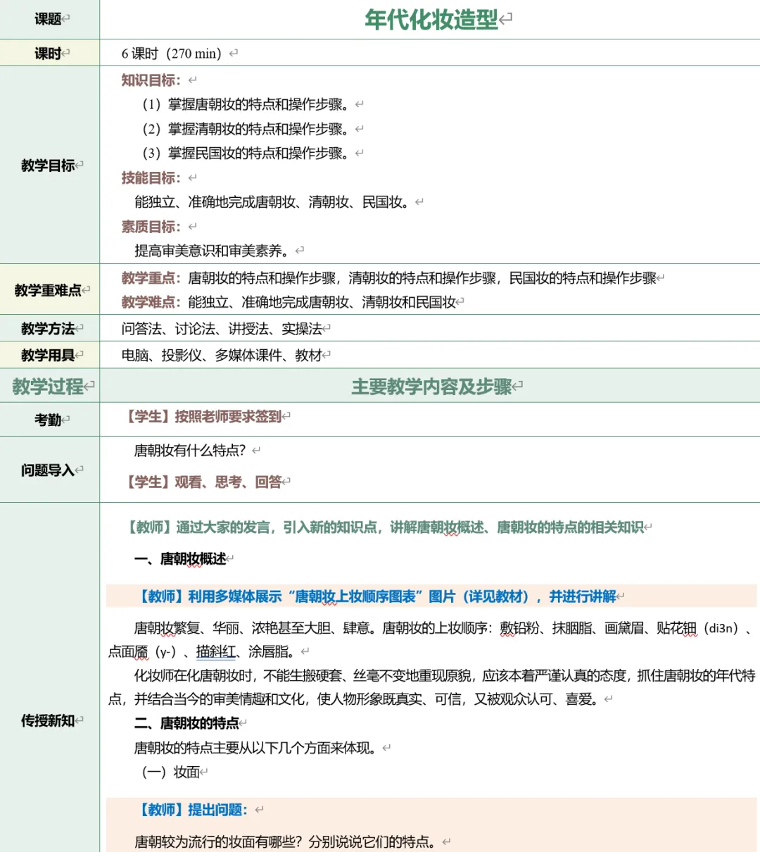 化妆造型教学培训PPT课件及教案的部分内容展示如下: