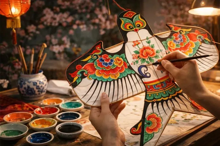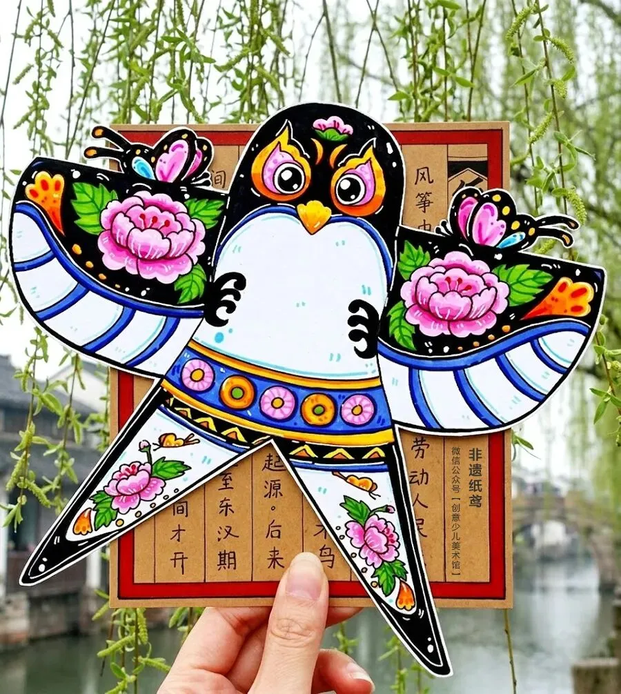 在各种各样的风筝里,有一种最经典、最灵动的造型,它的名字叫做——沙燕风筝。你们看,这只沙燕是不是像一只轻盈飞舞的小燕子?它的美藏在很多地方:首先是造型美,展开的翅膀像燕子在天空中滑翔,左右对称,看起来平稳又舒展;其次是花纹美,传统的沙燕上常常画着漂亮的图案,比如盛开的牡丹花、吉祥的纹样和有节奏的线条,每一处装饰都充满了东方艺术的韵律和祝福。
