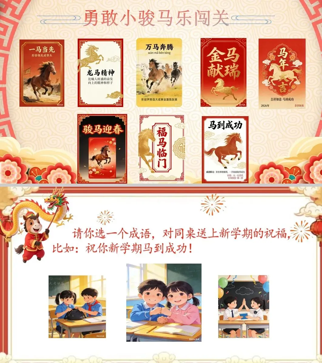 小结过渡:“马年成语藏着大大的祝福,希望大家带着这份祝福,在语文学习中也能‘马到成功’!”