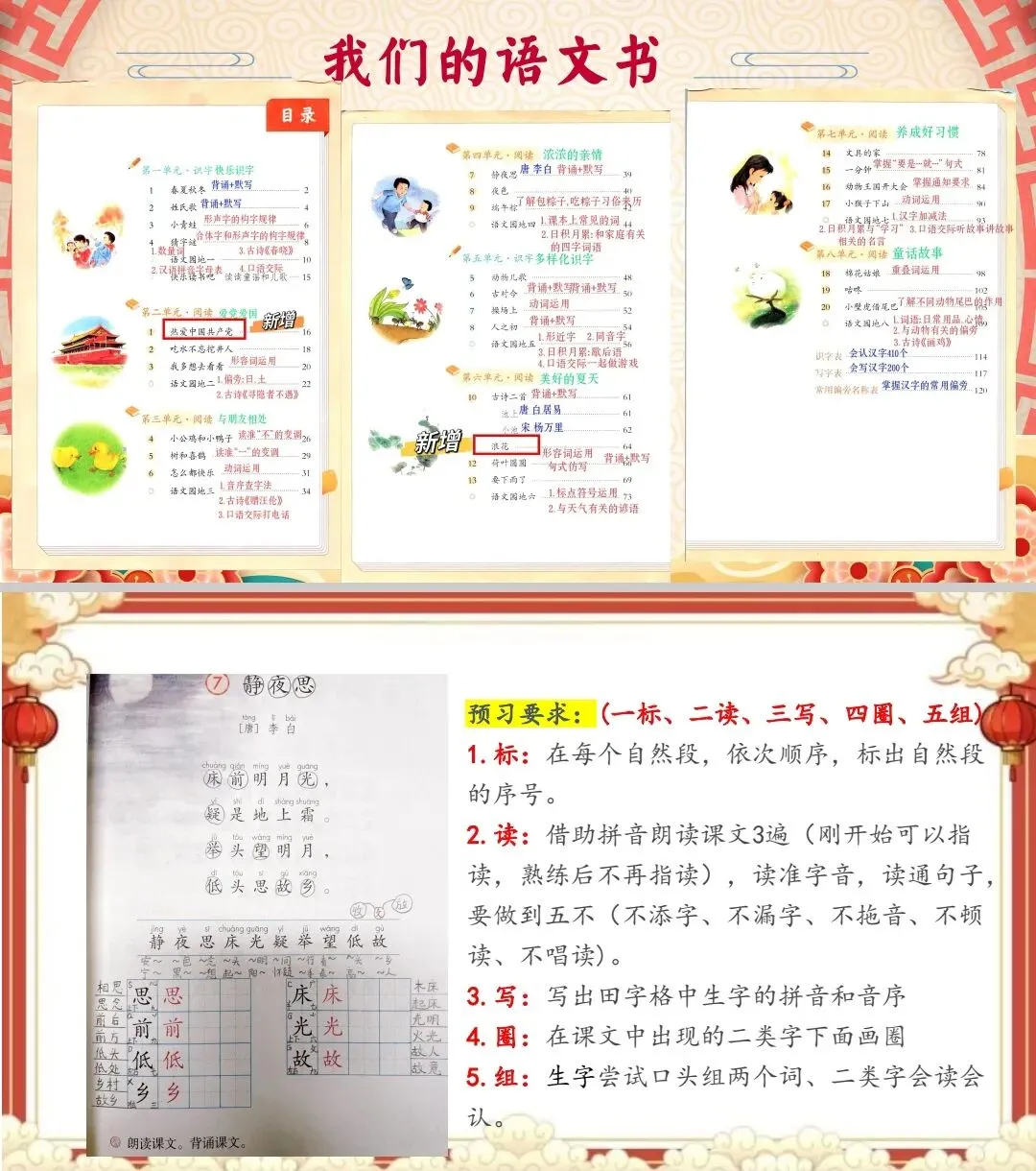 出示PPT“预习五步法”,教师结合一年级下册课文片段,逐一步骤示范: