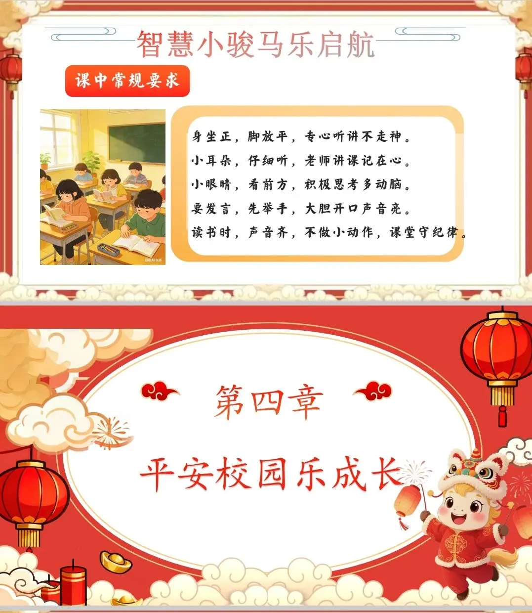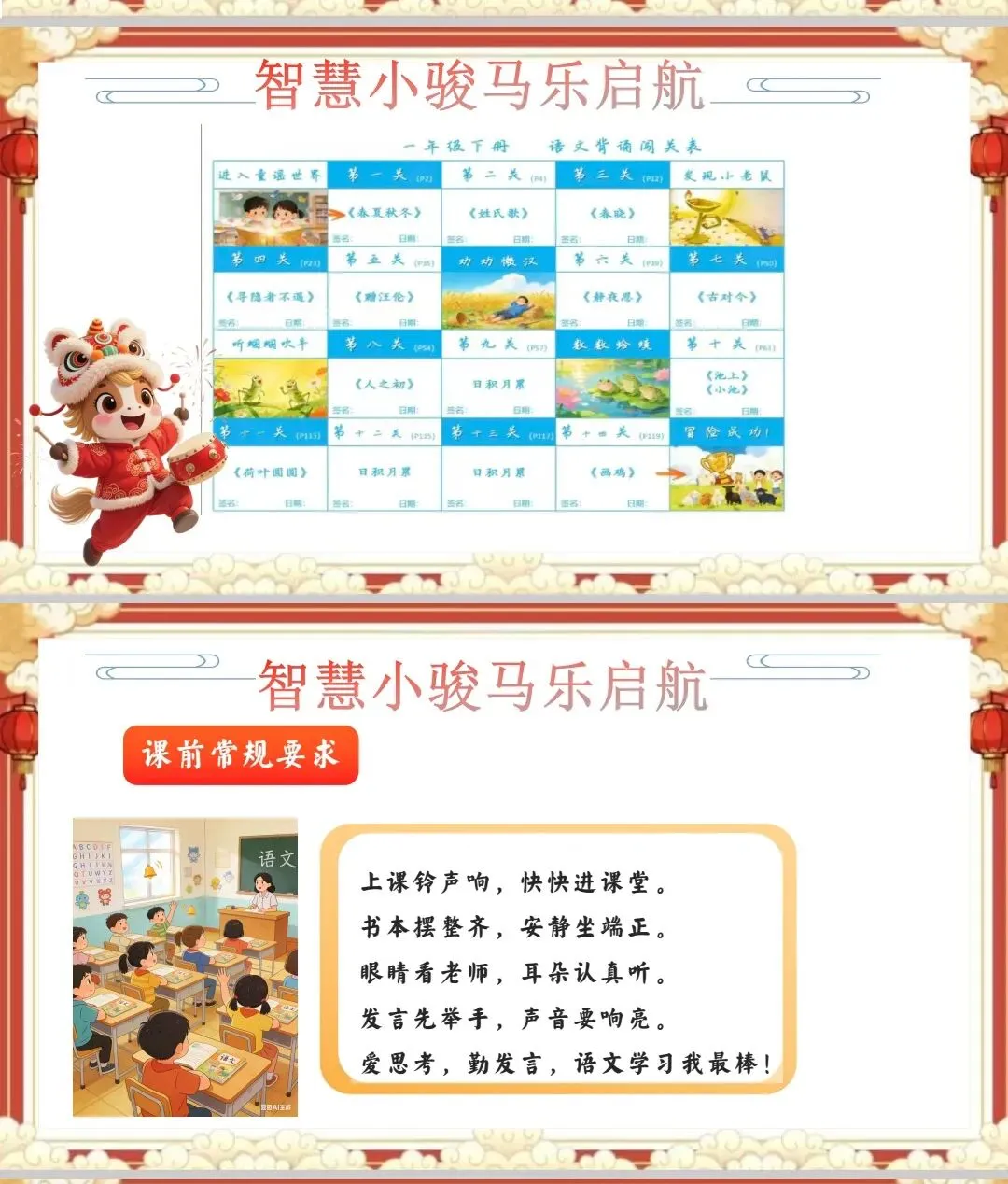 主题揭题:出示PPT封面,教师带领学生齐读课题“马蹄哒哒启新程 语文乐园趣前行”,并说明:“今天,我们要跟着‘小骏马’,一起解锁新学期的语文本领和校园新成长!”