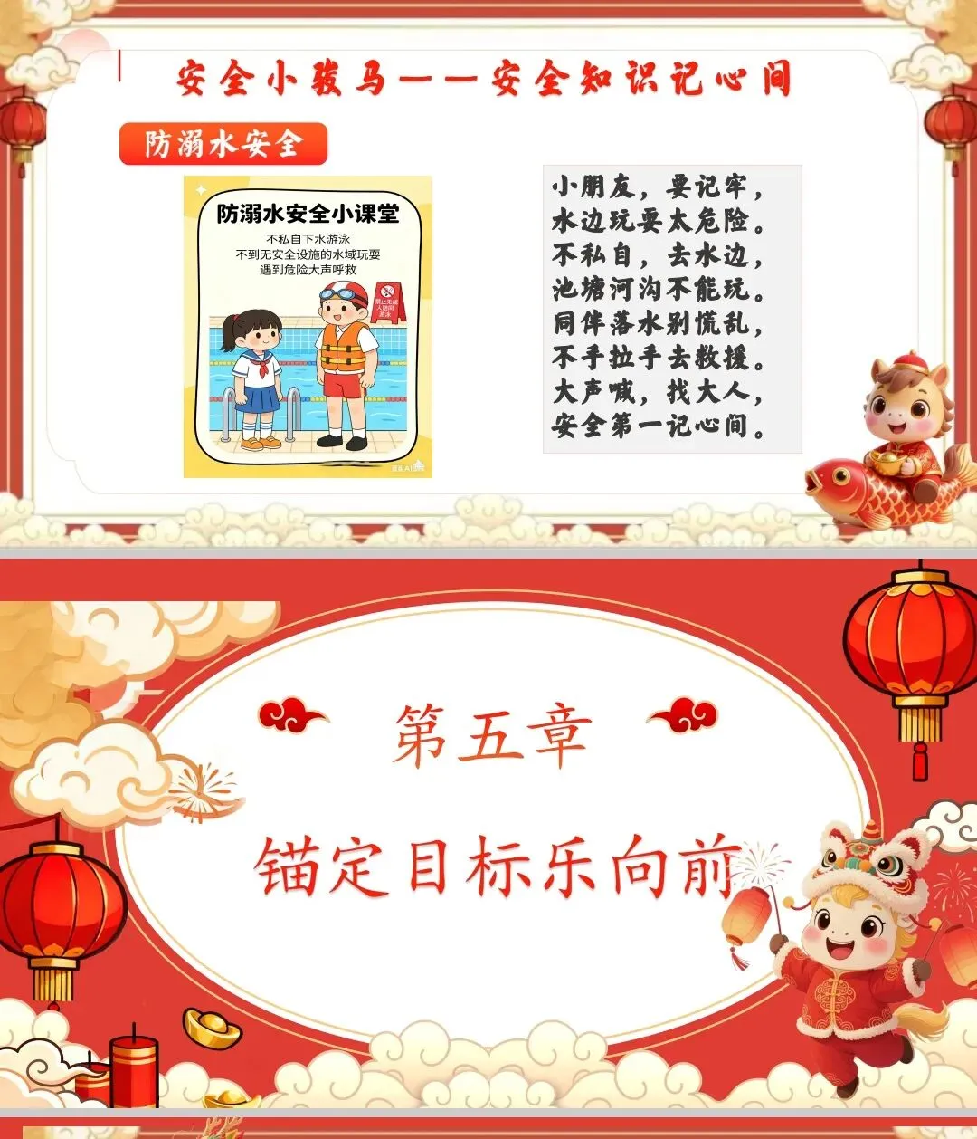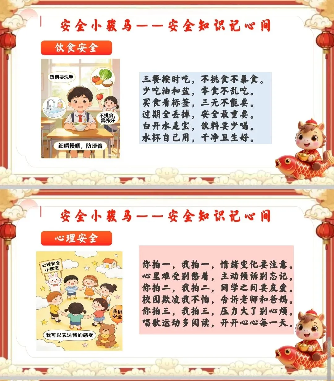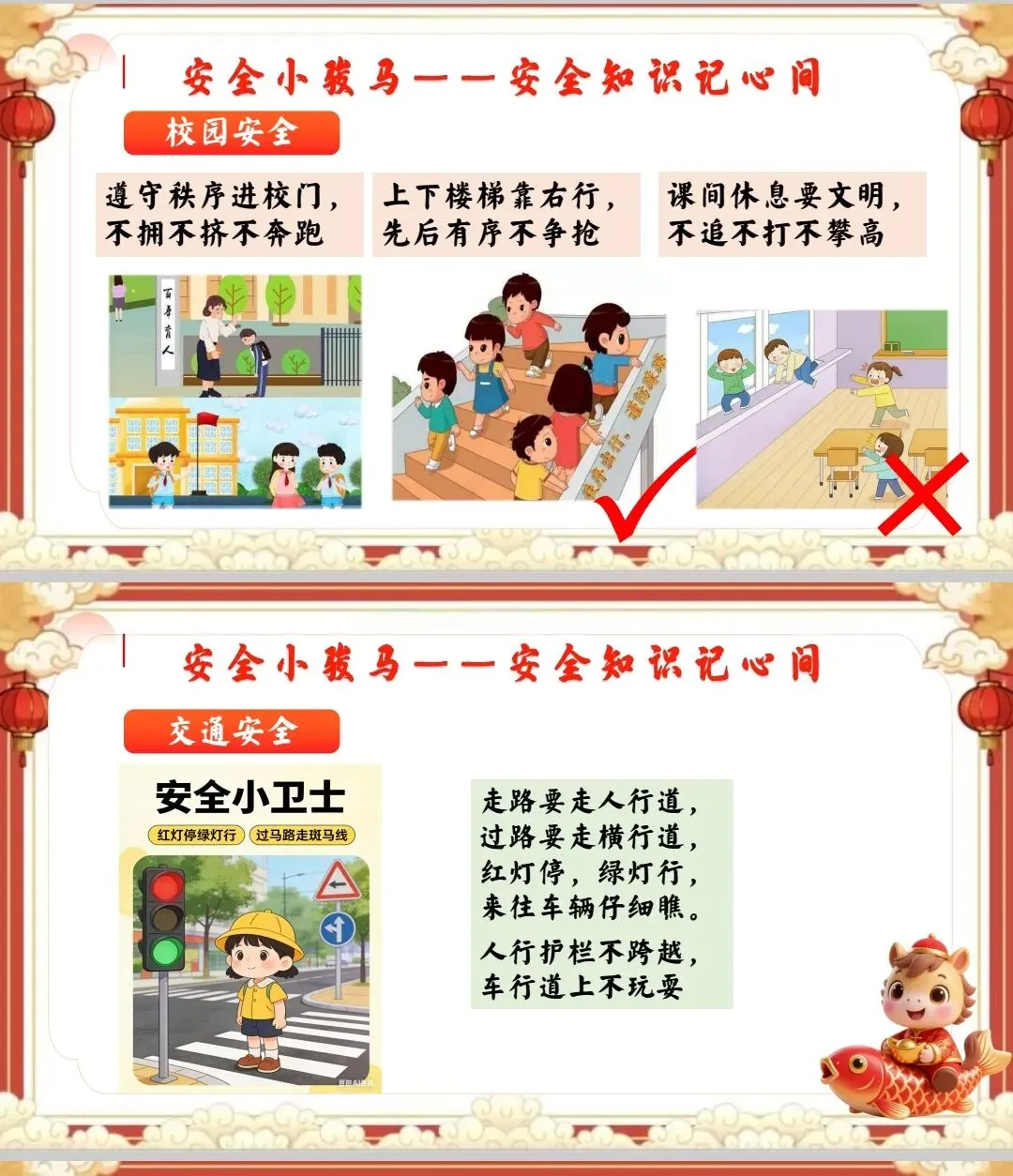 出示PPT“安全小骏马”板块,分模块展示安全图片: