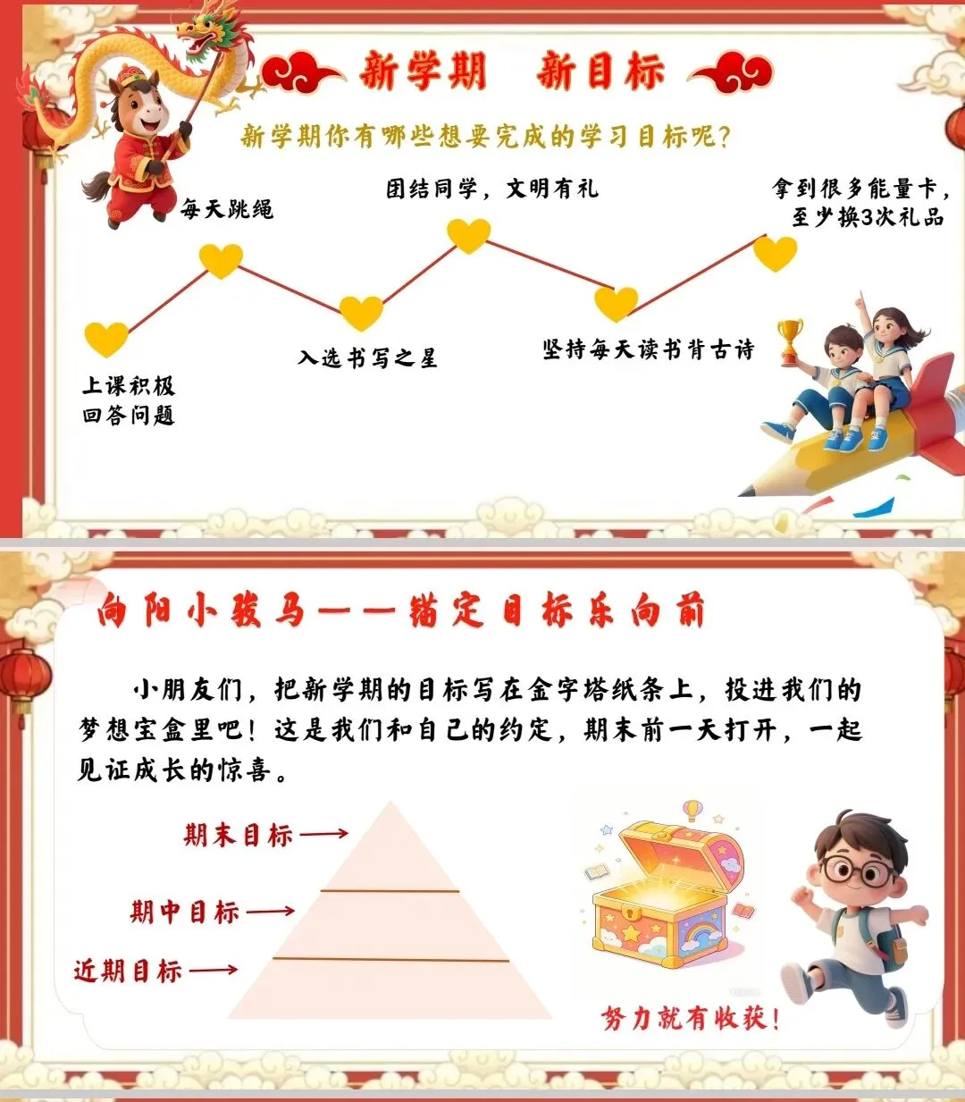 邀请2名学生展示目标卡,教师带领全班同学为他们送上“马到成功”的祝福,鼓励大家做“向阳小骏马”,朝着目标努力。